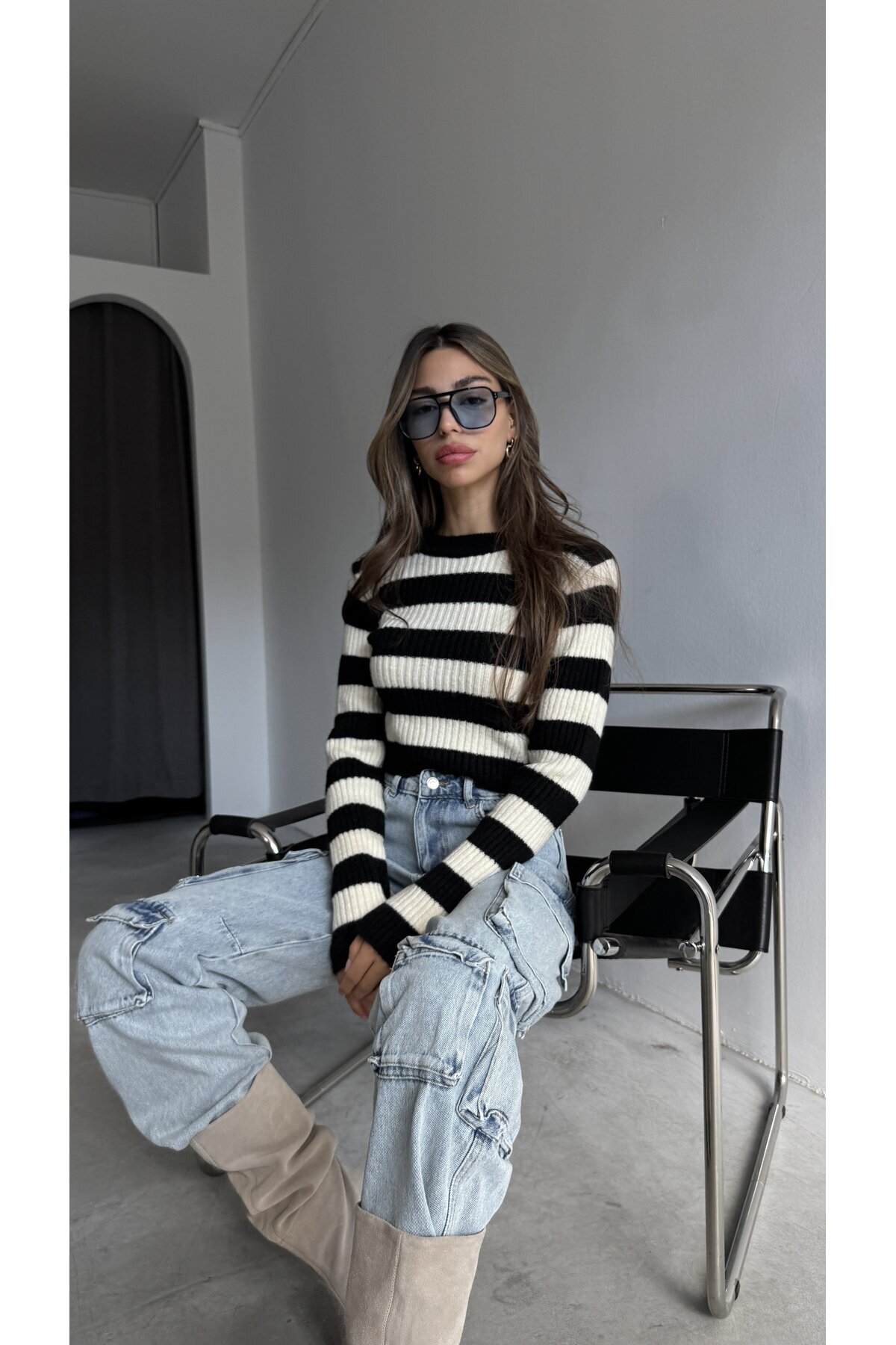 Kadın Kalın Şerit Çift Renk Pamuklu Uzun Kol Triko Bluz Kadın Kalın Şerit Çift Renk Pamuklu Uzun Kol Triko Bluz ZR4001 Standart