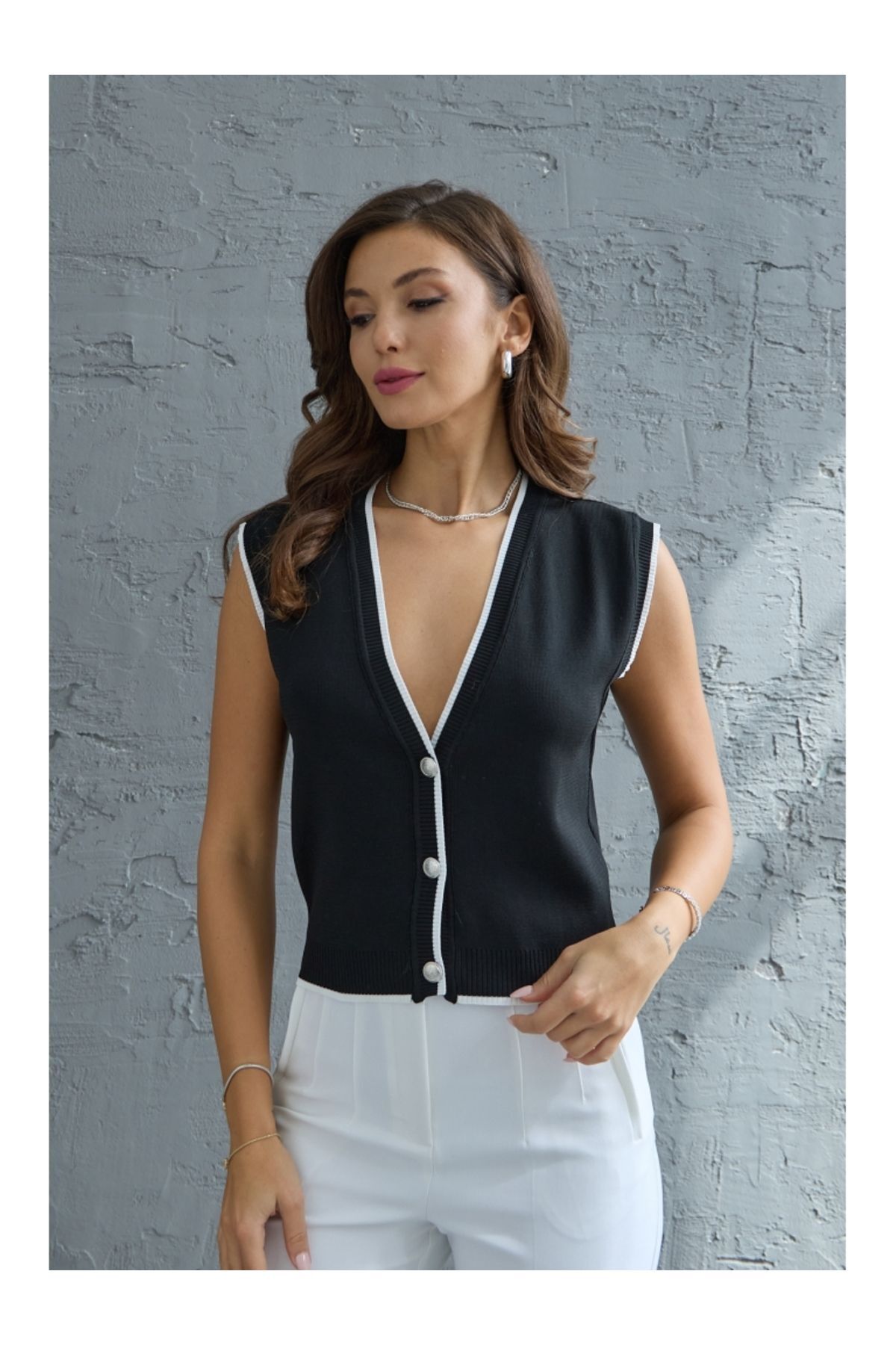 Beyaz Gümüş Düğmeli Triko Yelek Beyaz Gümüş Düğmeli Triko Yelek 0364 Standart