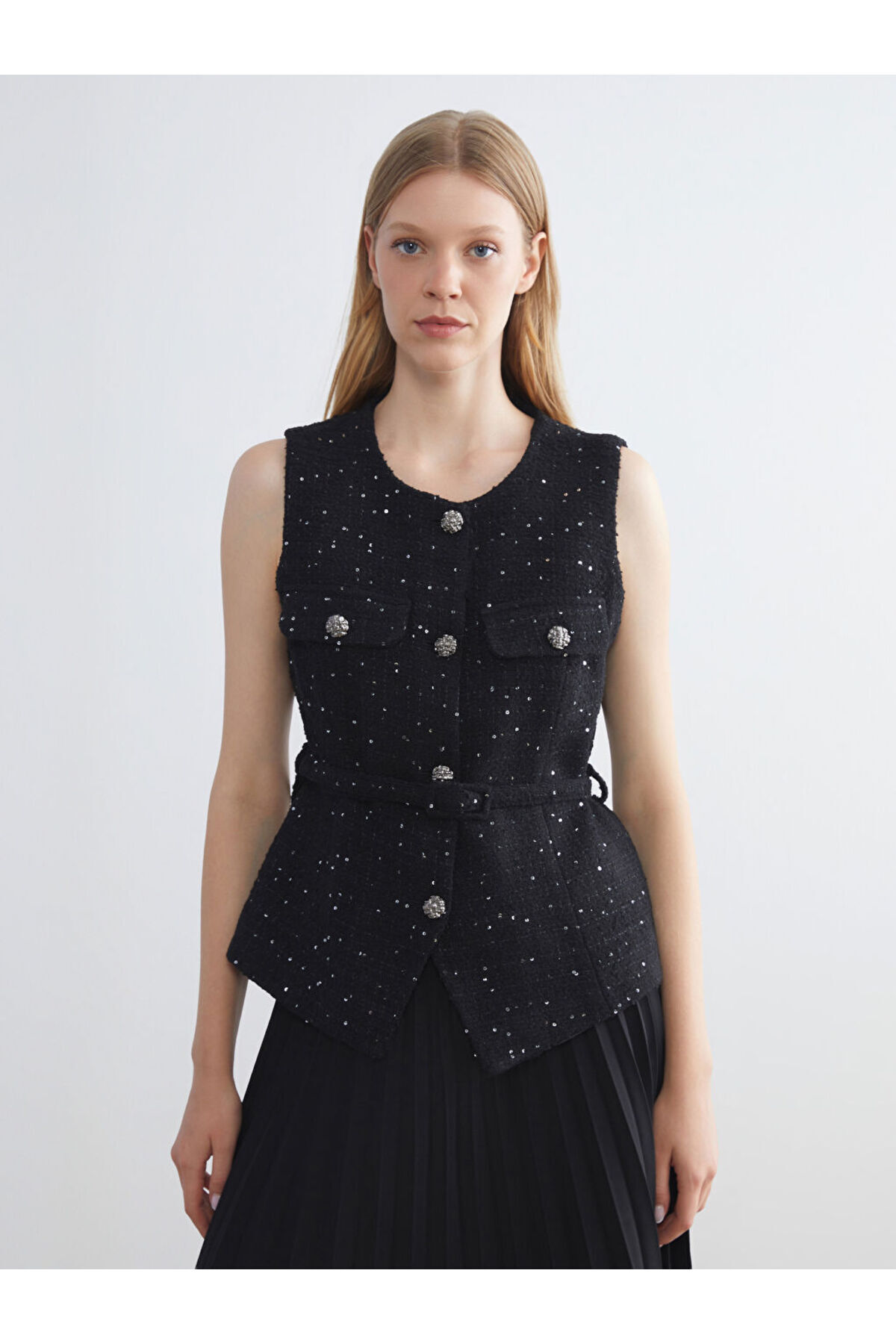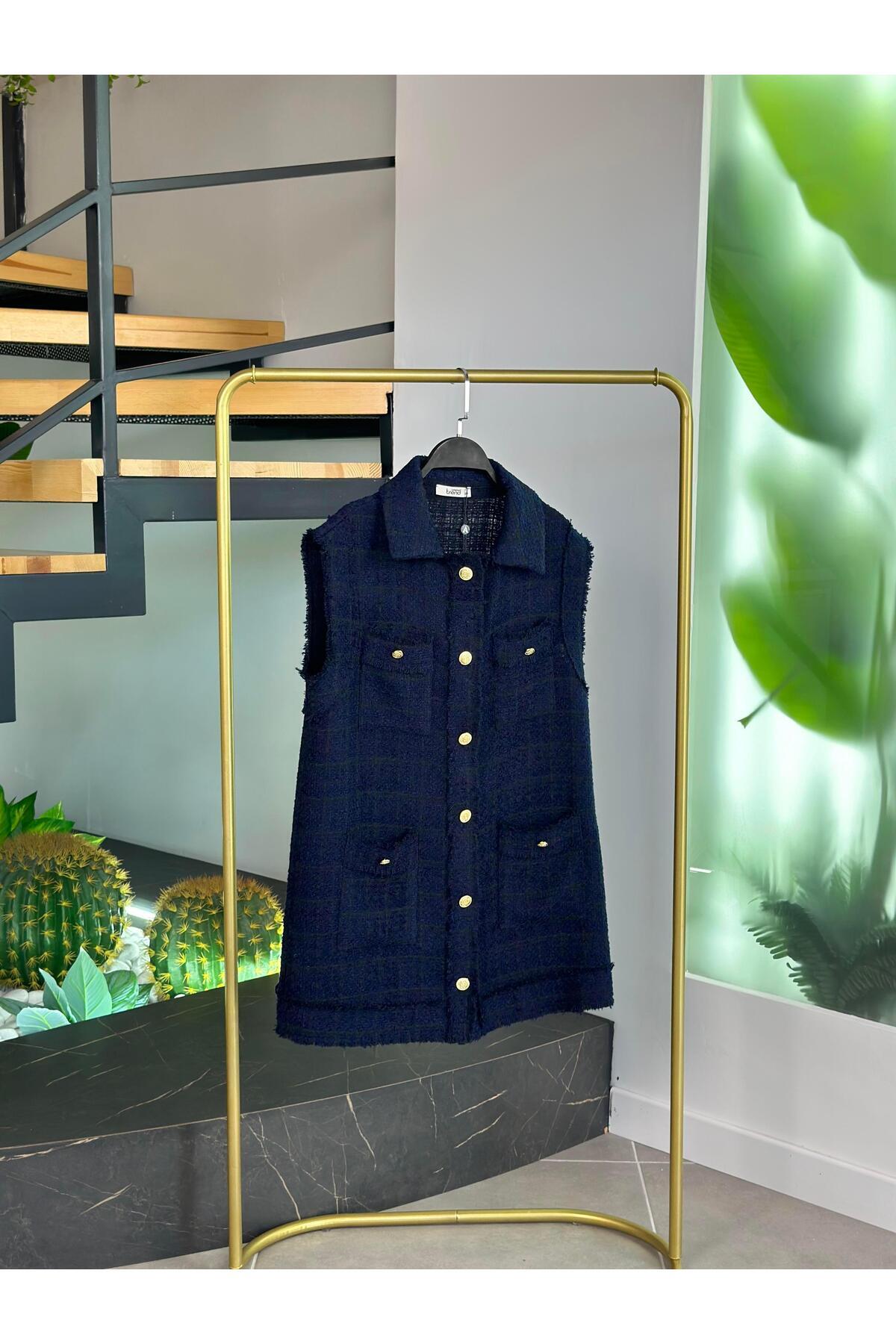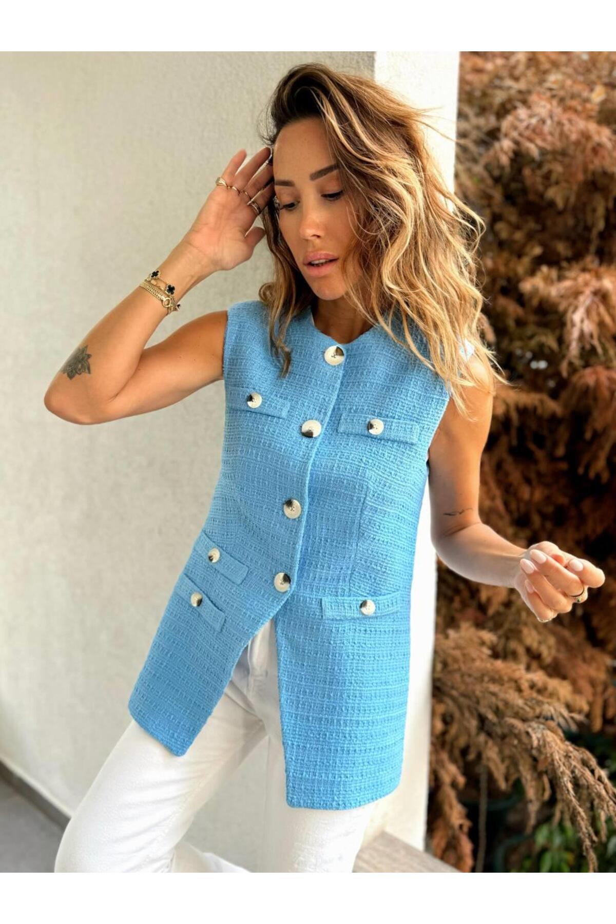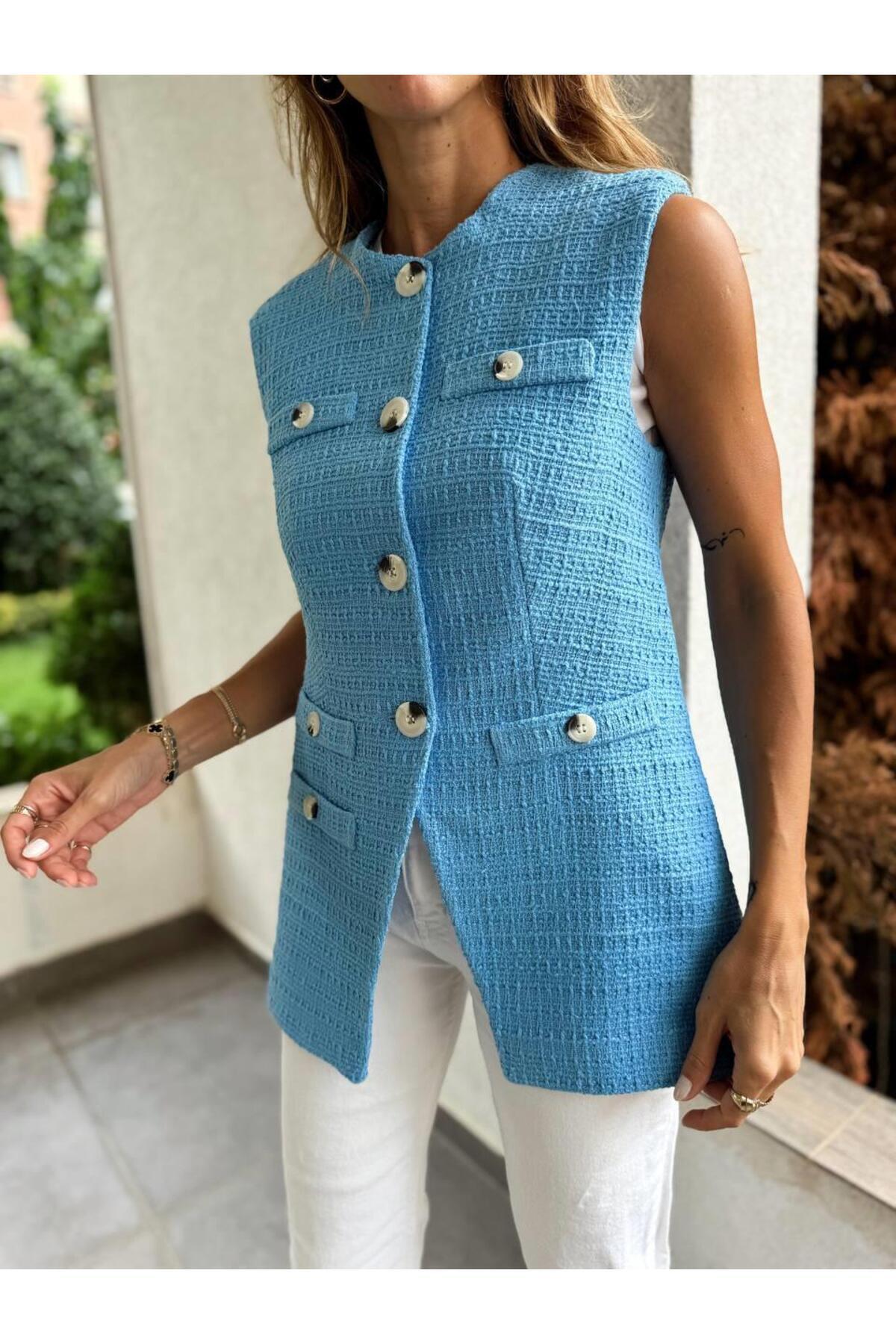 Kadın Tüvit Kumaş Uzun Mavi Fit Yelek Kadın Tüvit Kumaş Uzun Mavi Fit Yelek 25KY-02077 L
