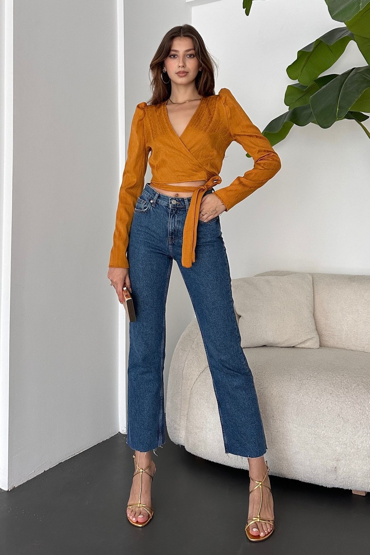 Kadın Kruvaze Yaka Uzun Kollu Bağlama Detaylı Crop Bluz Hardal Kadın Kruvaze Yaka Uzun Kollu Bağlama Detaylı Crop Bluz Hardal BLZ0173 XL