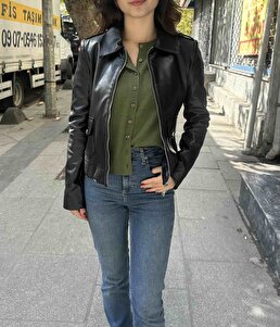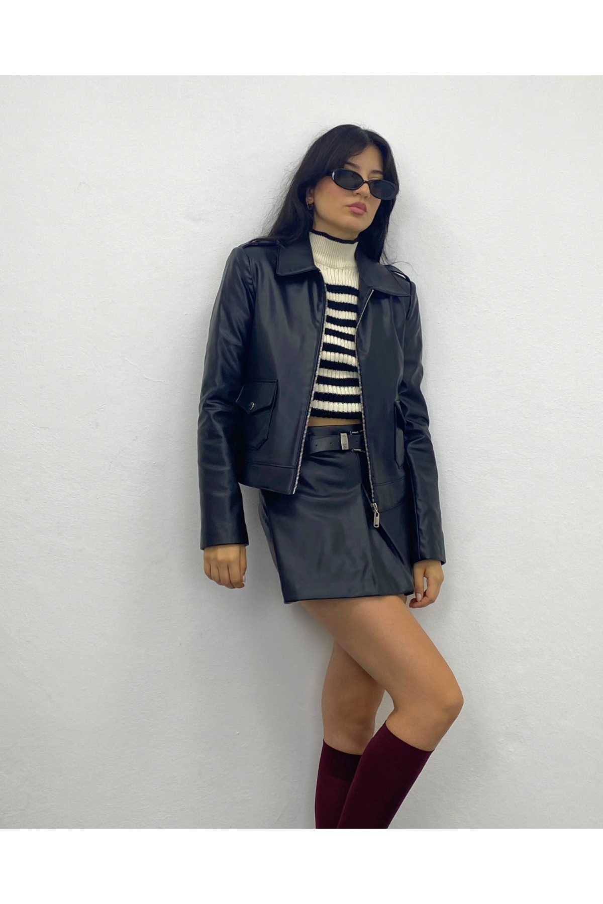 Kadın Siyah Fermuarlı Cep Detaylı Deri Mont Kadın Siyah Fermuarlı Cep Detaylı Deri Mont CKT002 42