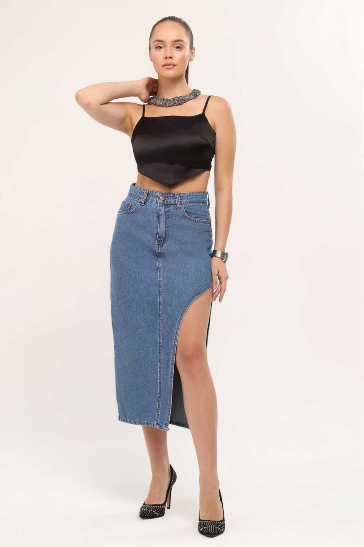 2094 Kadın Likrasız Yandan Yırtmaçlı Jeans Kot Denim Etek - Mavi 2094 Kadın Likrasız Yandan Yırtmaçlı Jeans Kot Denim Etek - Mavi PASS&PASS 2094 42