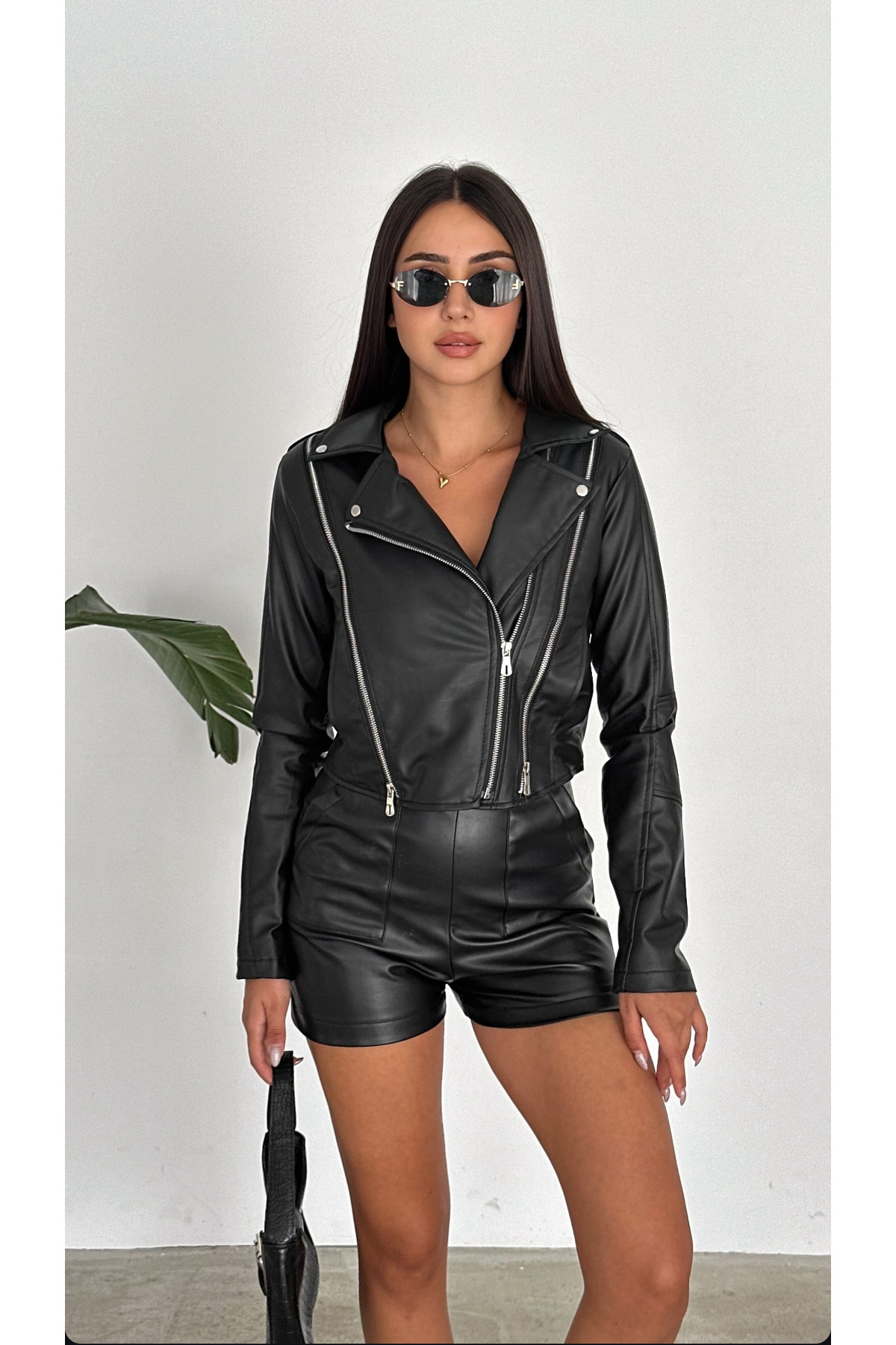 Kadın Çift Fermuarlı Siyah Kruvaze Kısa Deri Ceket Kadın Çift Fermuarlı Siyah Kruvaze Kısa Deri Ceket 1564NOA106 L