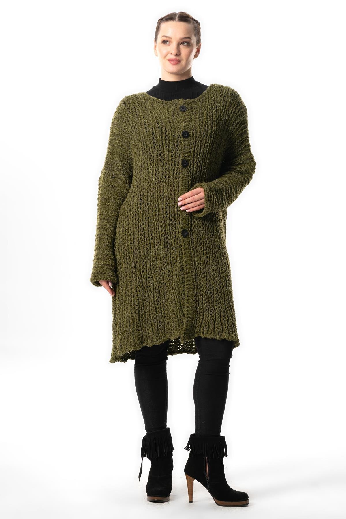 Uzun Kol Şehrazat Düğme Detaylı Sonbahar ve Kışlık Uzun Triko Hırka Haki Hk Uzun Kol Şehrazat Düğme Detaylı Sonbahar ve Kışlık Uzun Triko Hırka Haki Hk T10007 Standart