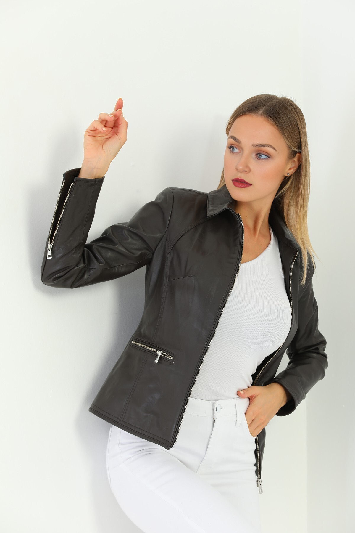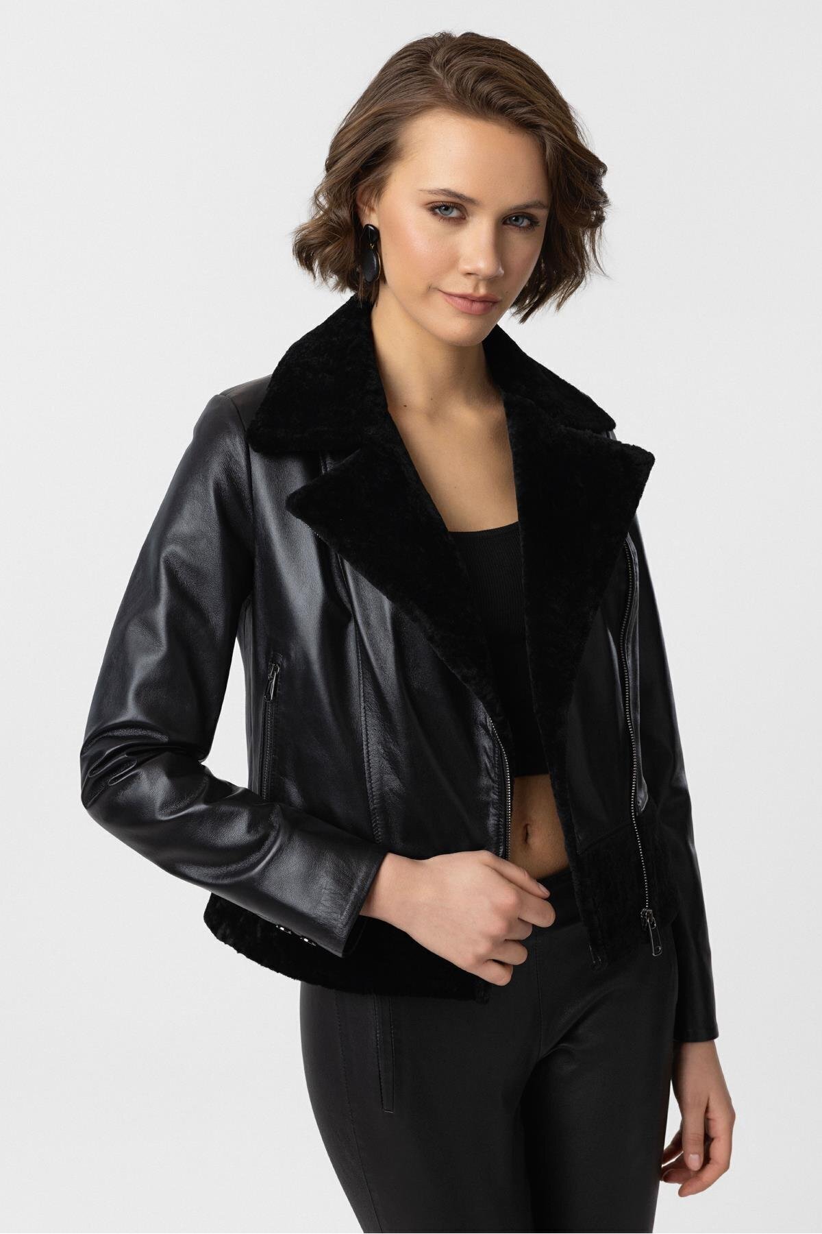 Camela Siyah Astarlı Büzgü Yakalı Kadın Hakiki Deri Ceket Camela Siyah Astarlı Büzgü Yakalı Kadın Hakiki Deri Ceket 09962DM17.000000000001 40