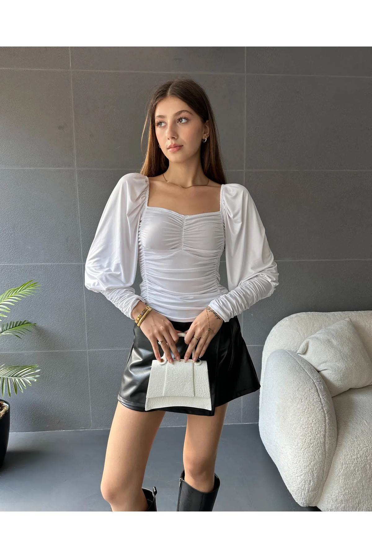 Kadın Kalp Yaka Balon Kol Drapeli Uzun Kollu Bluz Siyah Kadın Kalp Yaka Balon Kol Drapeli Uzun Kollu Bluz Siyah BLZ0176 XL