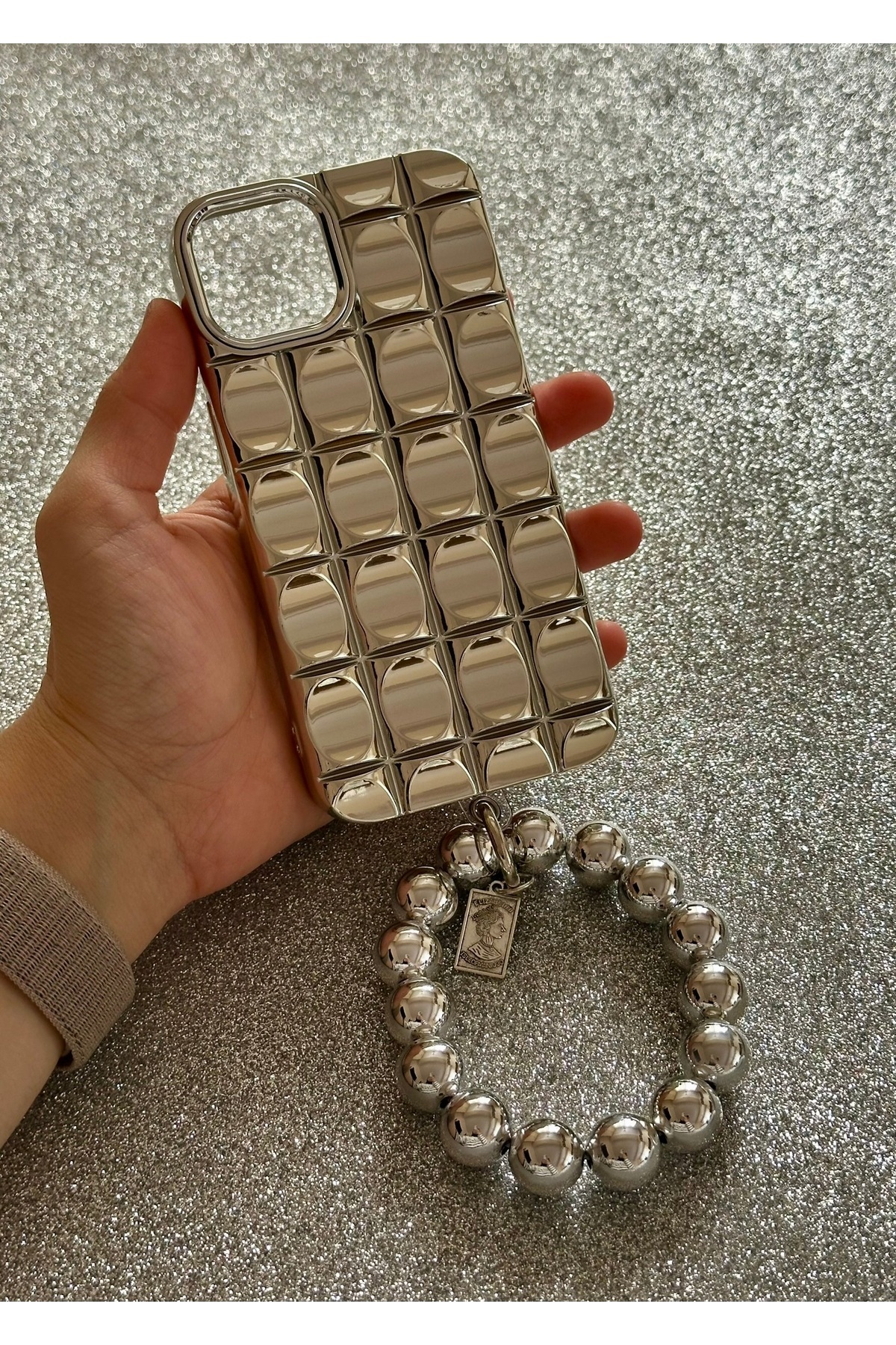 Iphone 15 Pro Max (6.7 inç) Uyumlu Bileklik Charm Aksesuarlı Parlak Nikelaj Gümüş Lux Kılıf