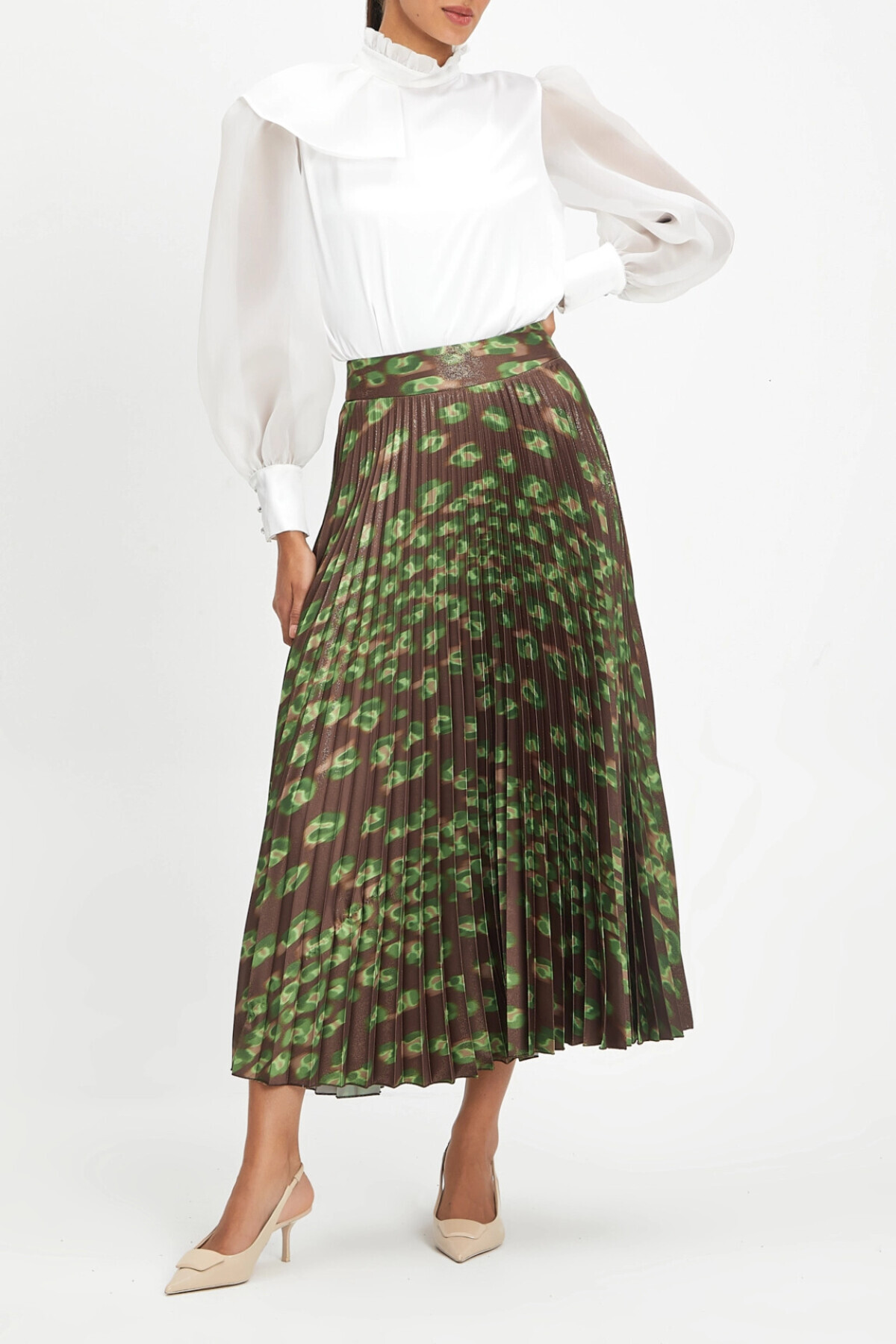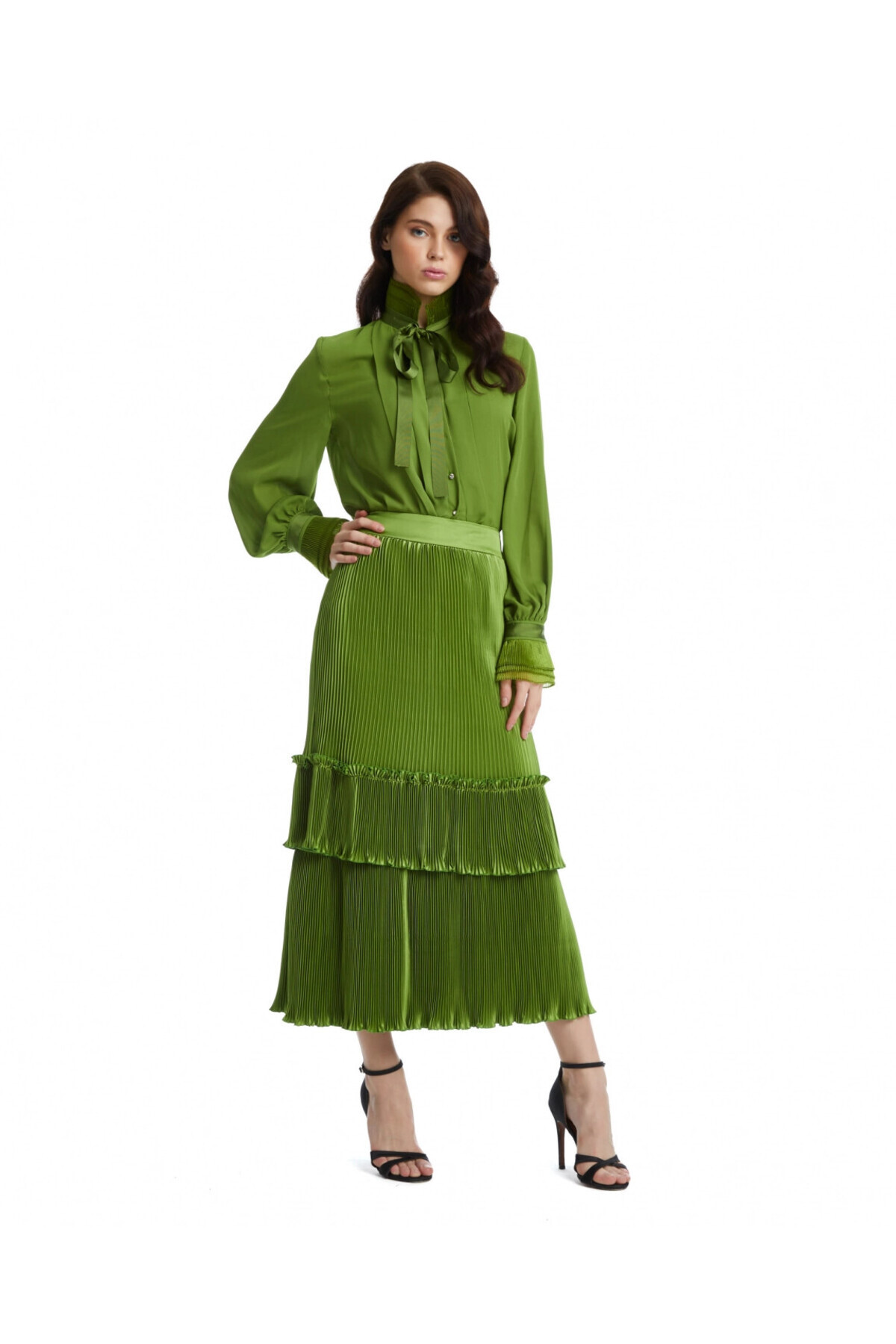 Pileli Yüksek Bel Şifon Midi Boy Yeşil Etek 40250 Pileli Yüksek Bel Şifon Midi Boy Yeşil Etek 40250 2411340250-13 42