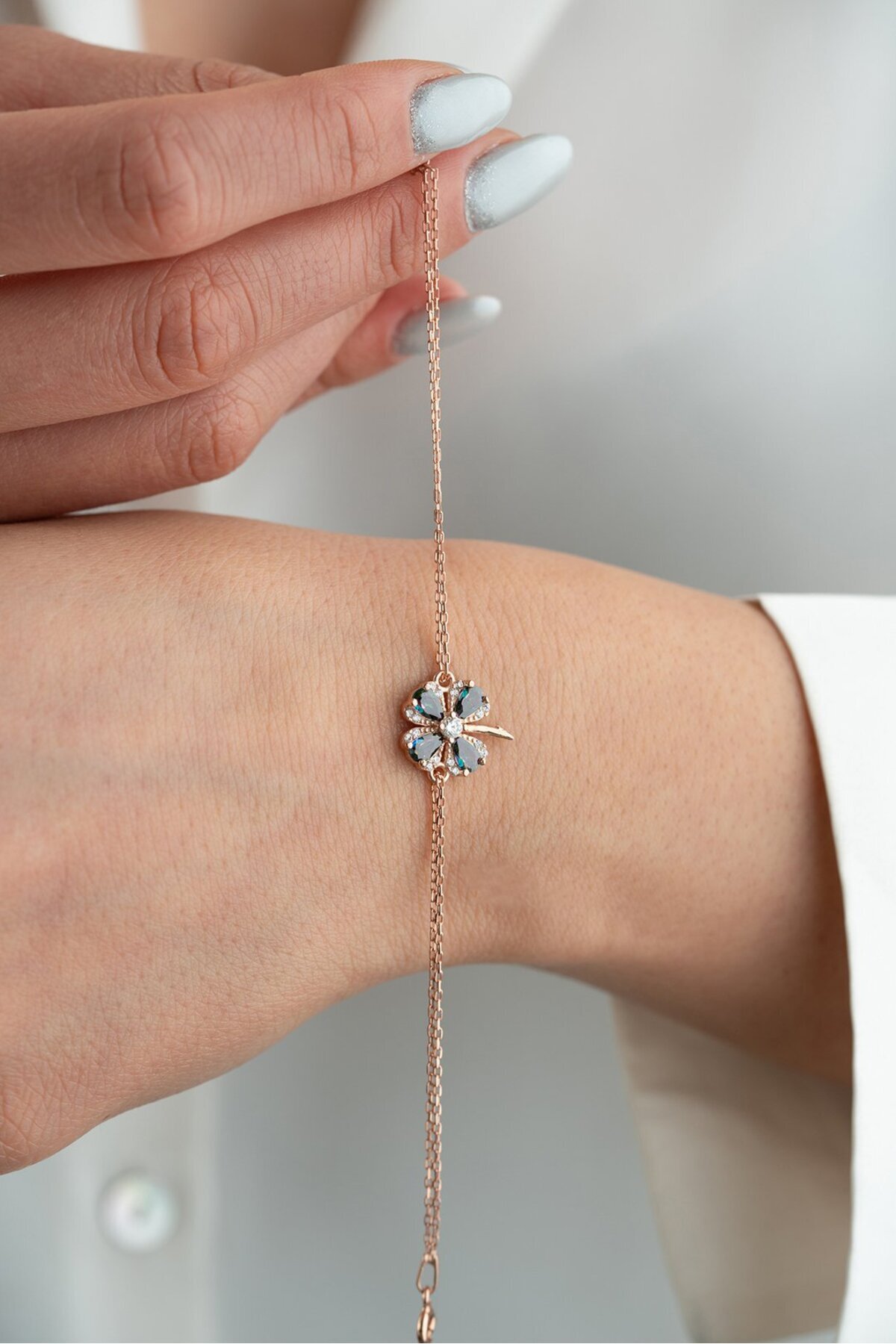 925 Ayar Gümüş Rodyum Kaplama Doç Zincir Beyaz Taşlı Yonca Bileklik 925 Ayar Gümüş Rodyum Kaplama Doç Zincir Beyaz Taşlı Yonca Bileklik NRZ999950 تک سایز