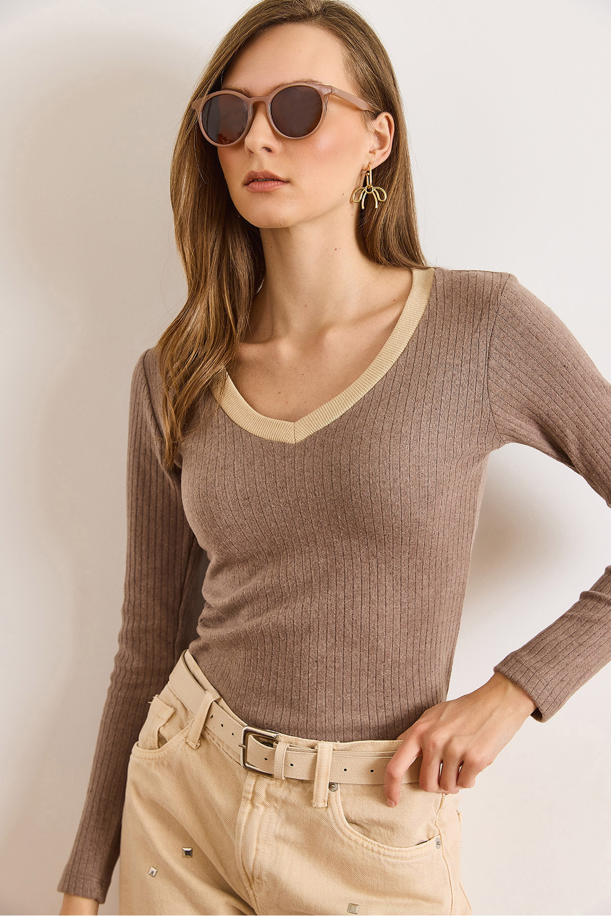 Kadın Taş Beyaz Yaka Detaylı Şardonlu Likralı Bluz BLZ-19002746 Kadın Taş Beyaz Yaka Detaylı Şardonlu Likralı Bluz BLZ-19002746 L/XL