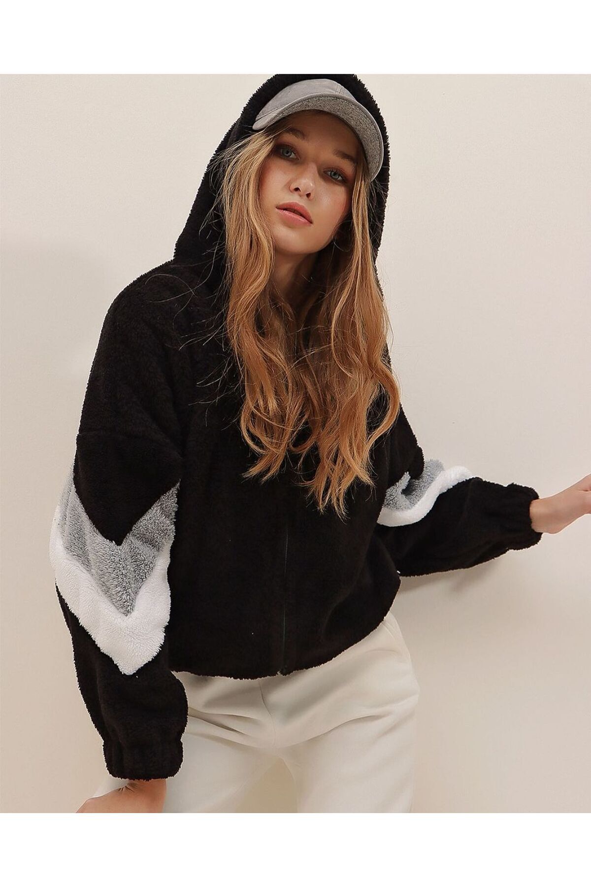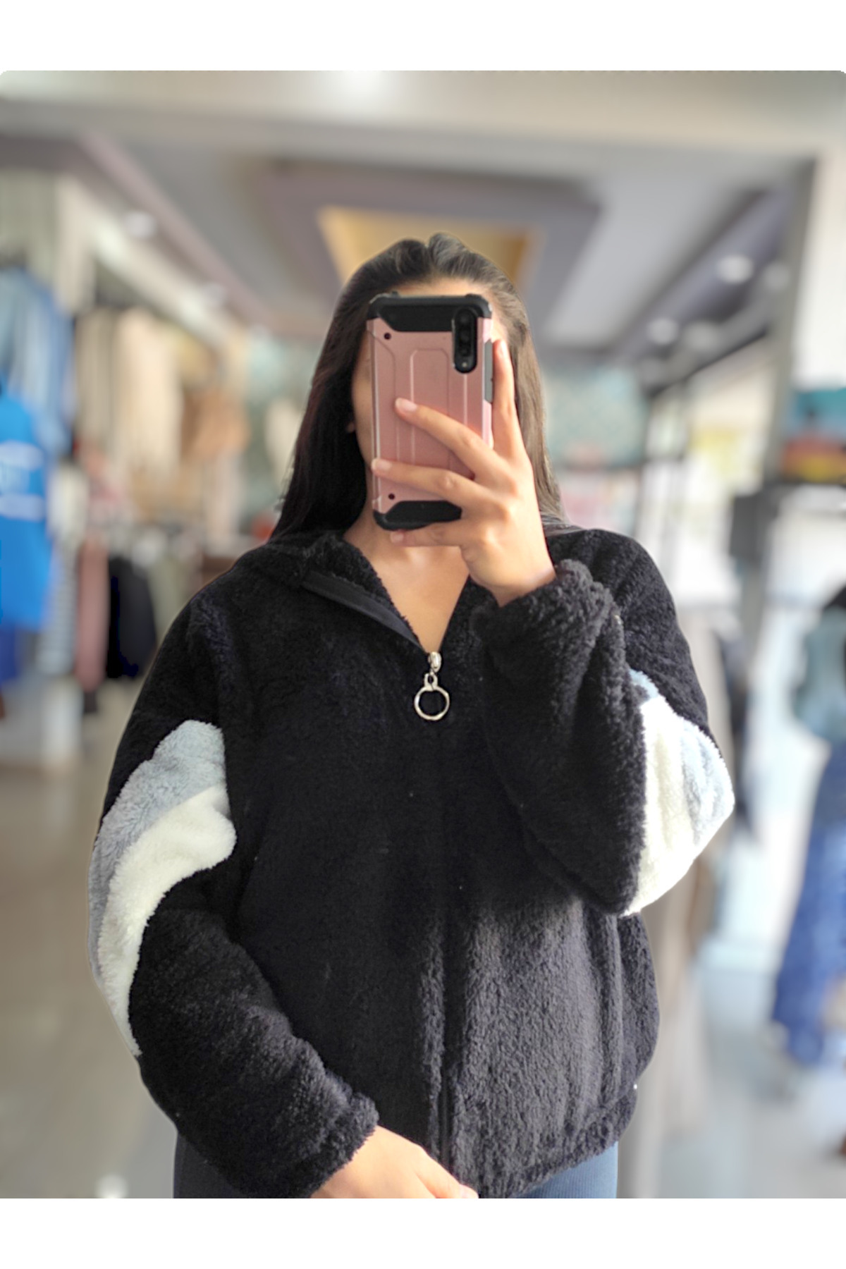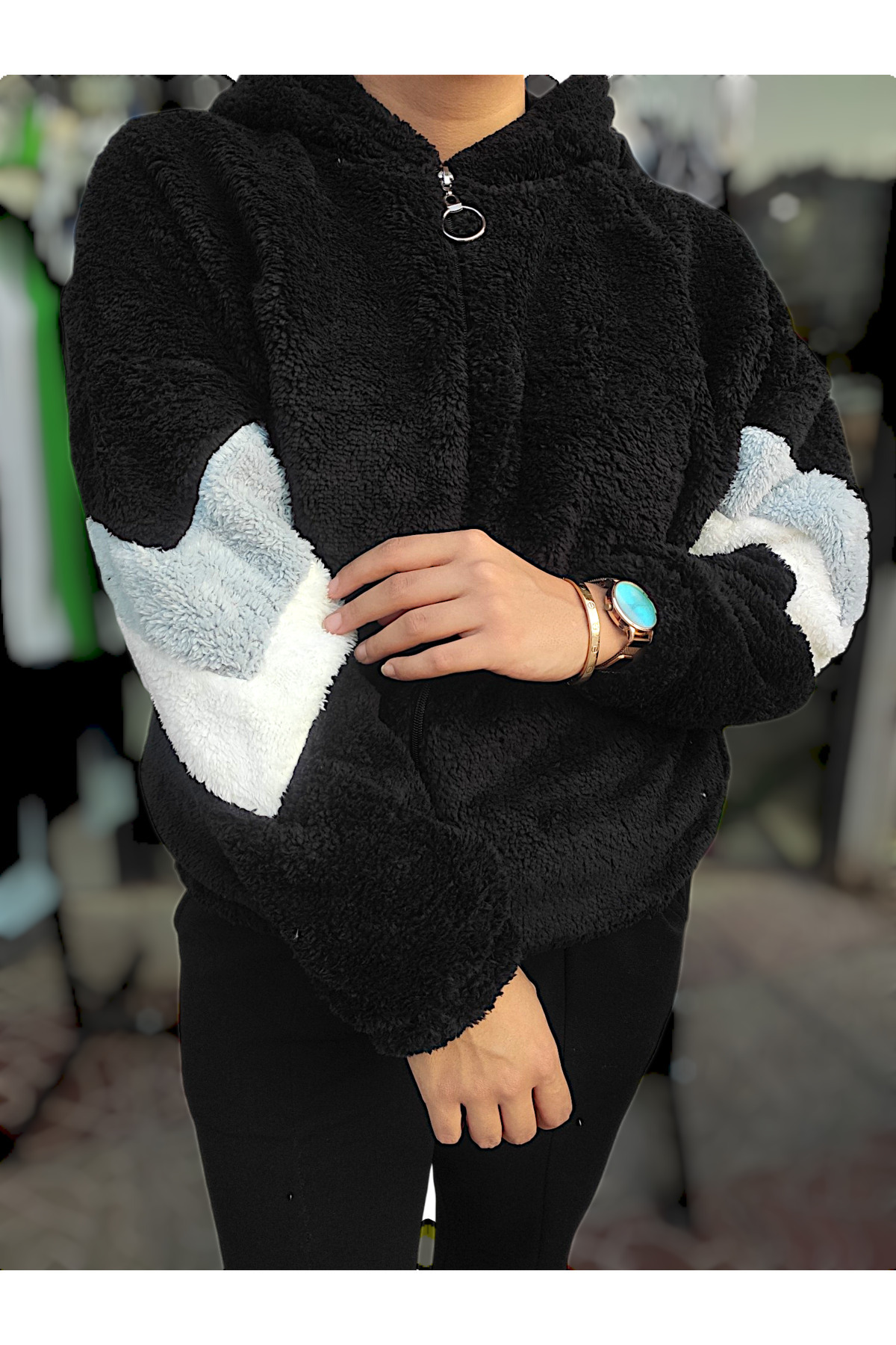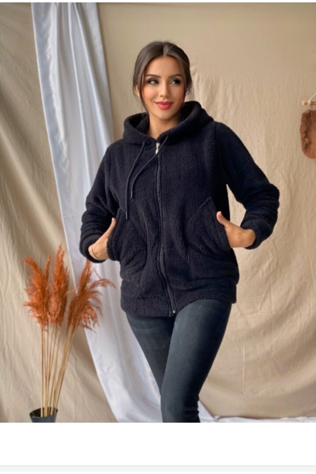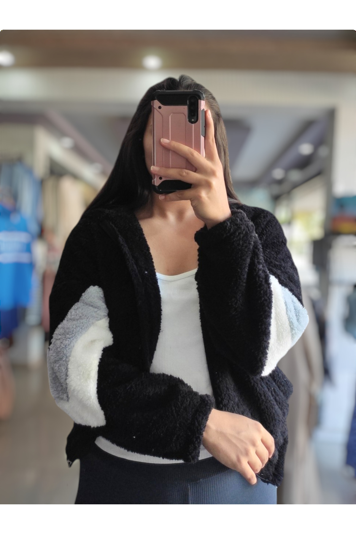Peluş Kol Garnili Kapüşonlu Hırka Peluş Kol Garnili Kapüşonlu Hırka SublPelusGarn L