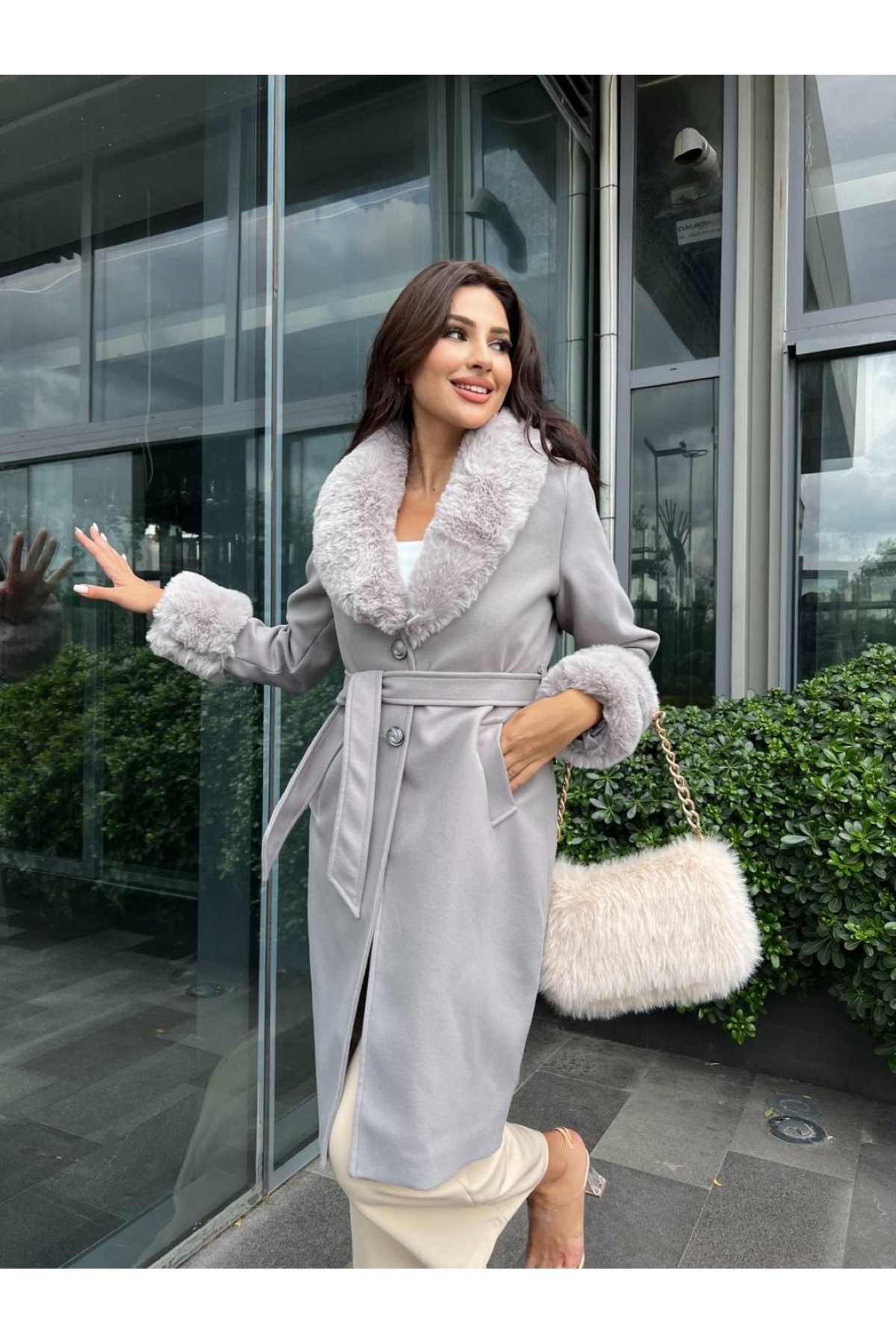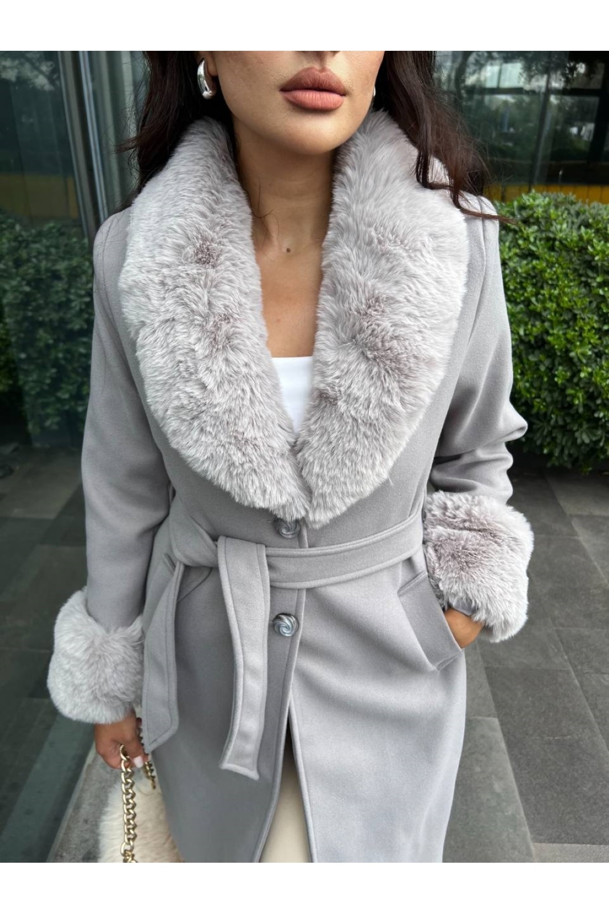 Yakası ve Kol Ağzı Kürklü Kuşaklı Gri Kaşe Manto Yakası ve Kol Ağzı Kürklü Kuşaklı Gri Kaşe Manto grsskkman012 46