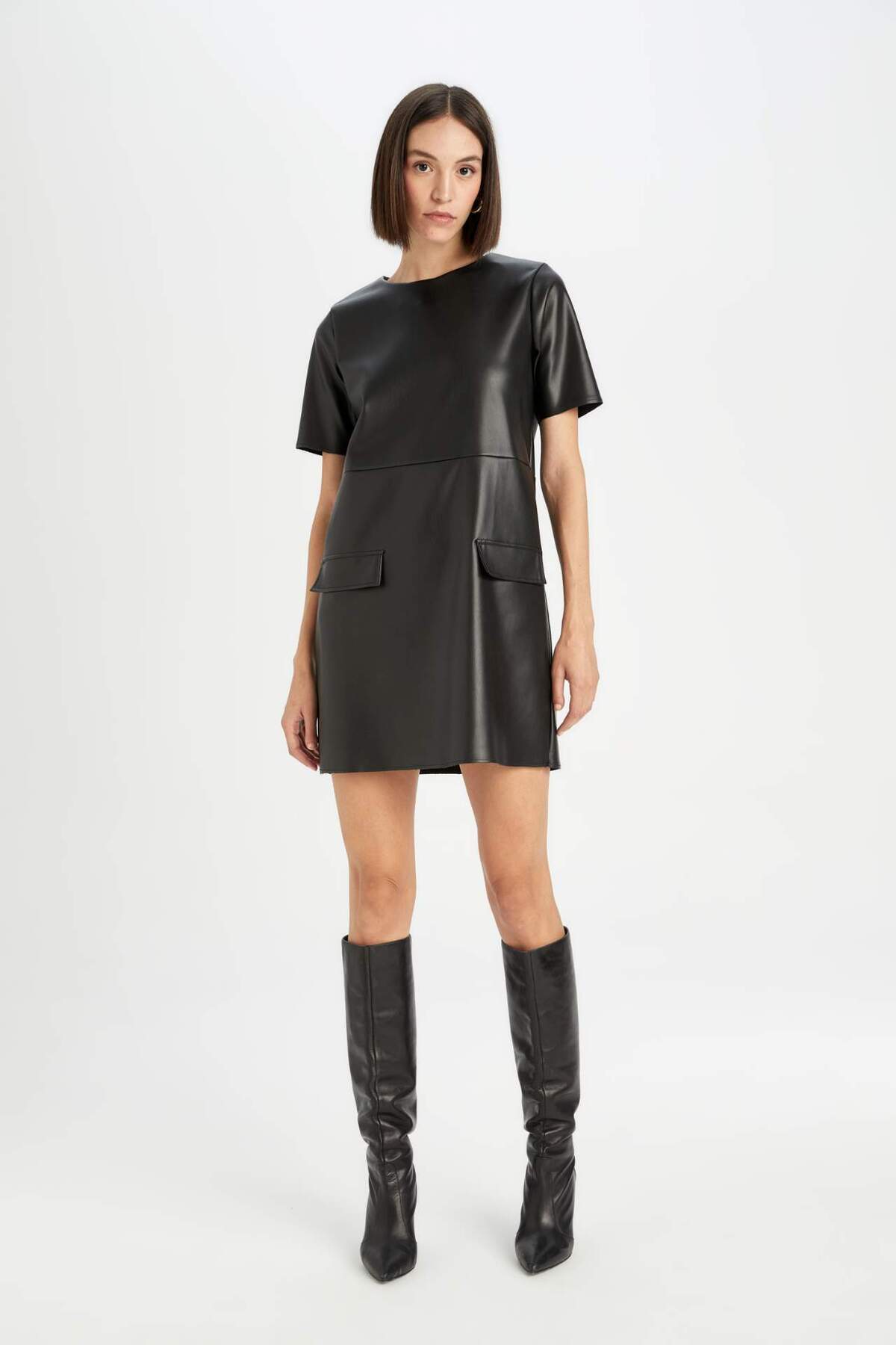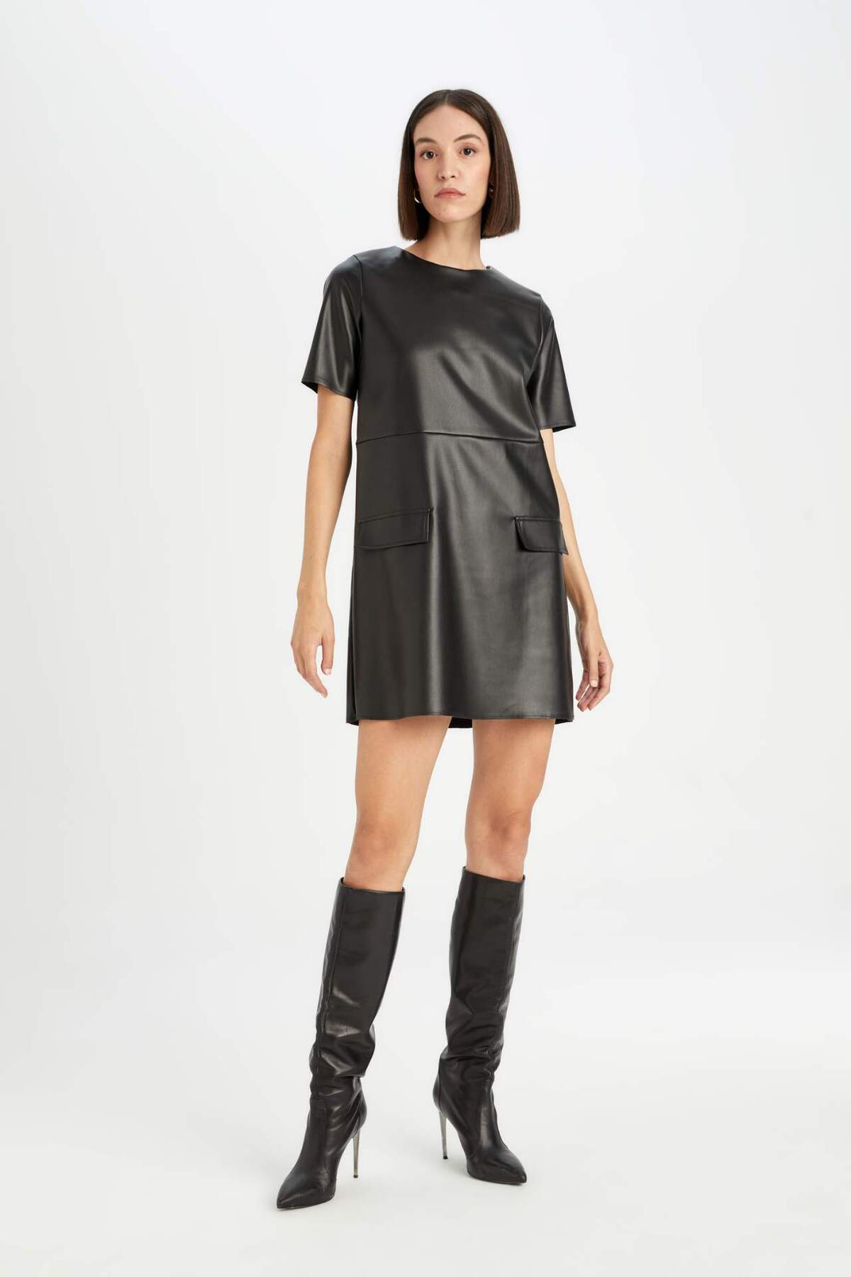 A Kesim Yuvarlak Yaka Basic Düz Suni Deri Kısa Kollu Mini Elbise E1012AX24WN A Kesim Yuvarlak Yaka Basic Düz Suni Deri Kısa Kollu Mini Elbise E1012AX24WN 40