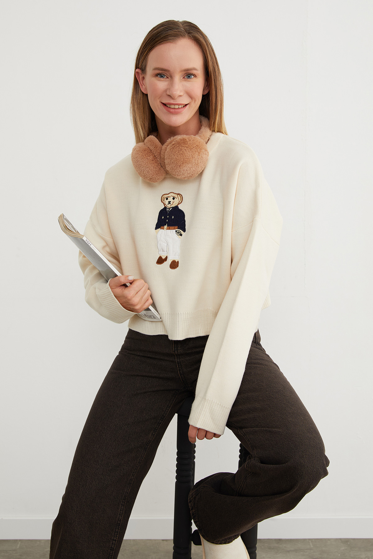 Bej Süzene Bear Nakışlı Bisiklet Yaka Kadın Triko Kazak Bej Süzene Bear Nakışlı Bisiklet Yaka Kadın Triko Kazak 26861 Standart