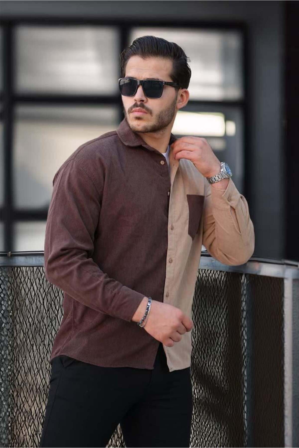 Kontrast Çift Renk Fitilli Kadife Gömlek - Kahve Kontrast Çift Renk Fitilli Kadife Gömlek - Kahve G10104 XL