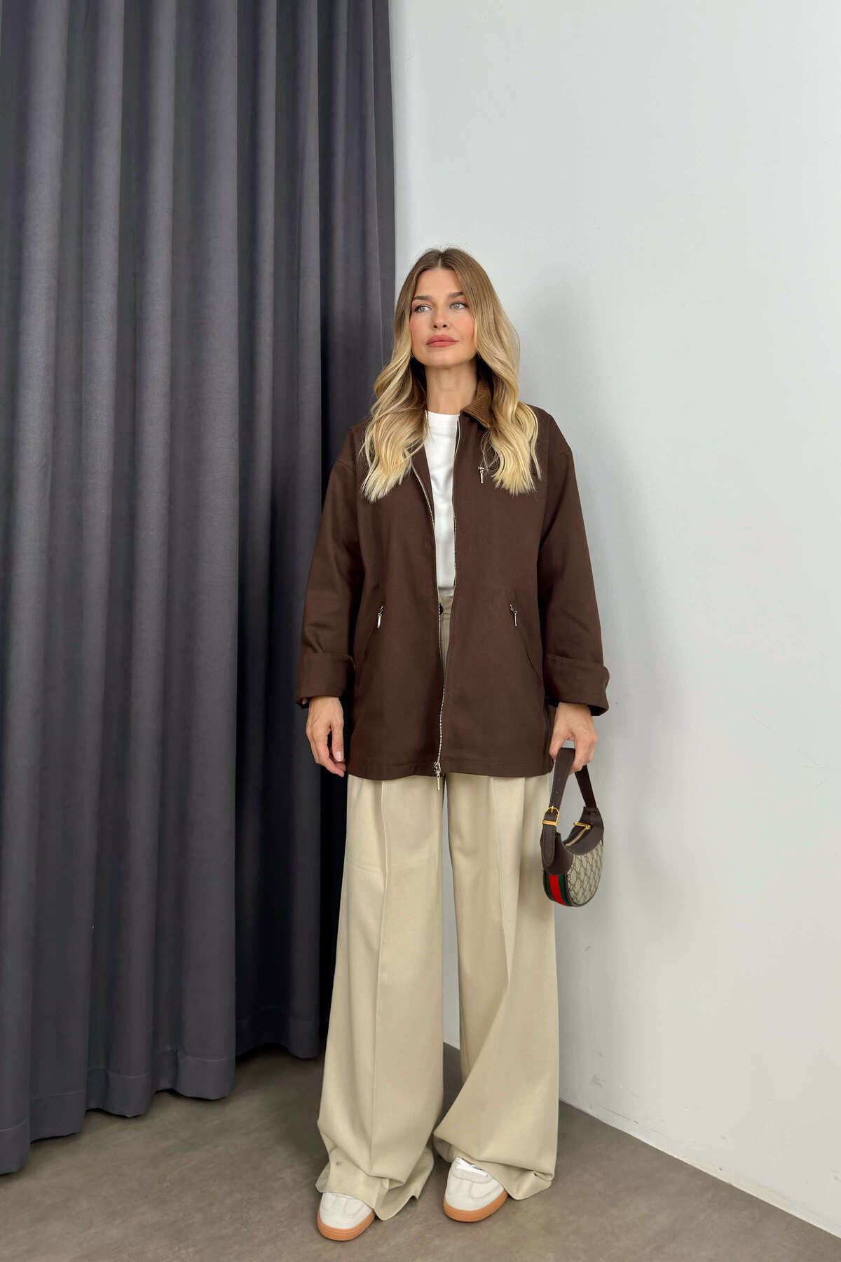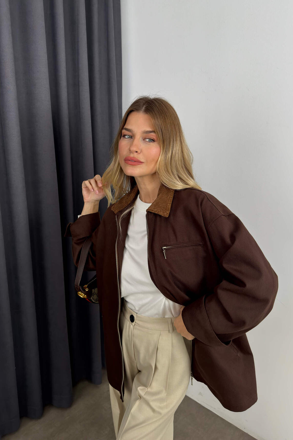 Koyu Kahve Kadife Yakalı Oversize Gabardin Ceket Koyu Kahve Kadife Yakalı Oversize Gabardin Ceket CKT1019 L