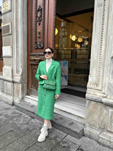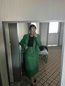 Kadın Düğme Detaylı Uzun Yırtmaçlı Etek Kısa Ceket Tüvit Kumaş Ceket Ve Etek Takımı YEŞİL Kadın Düğme Detaylı Uzun Yırtmaçlı Etek Kısa Ceket Tüvit Kumaş Ceket Ve Etek Takımı YEŞİL CET3003 XL
