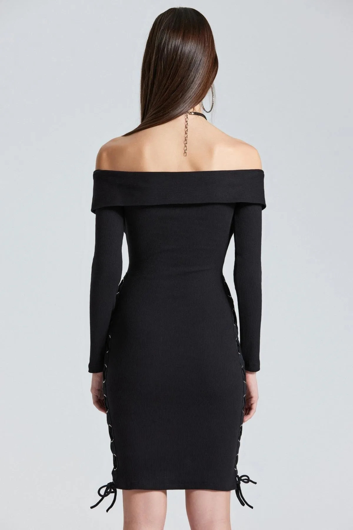 WFT1880 Yanları Kuşgözlü Madonna Yaka Siyah Elbise WFT1880 Yanları Kuşgözlü Madonna Yaka Siyah Elbise L