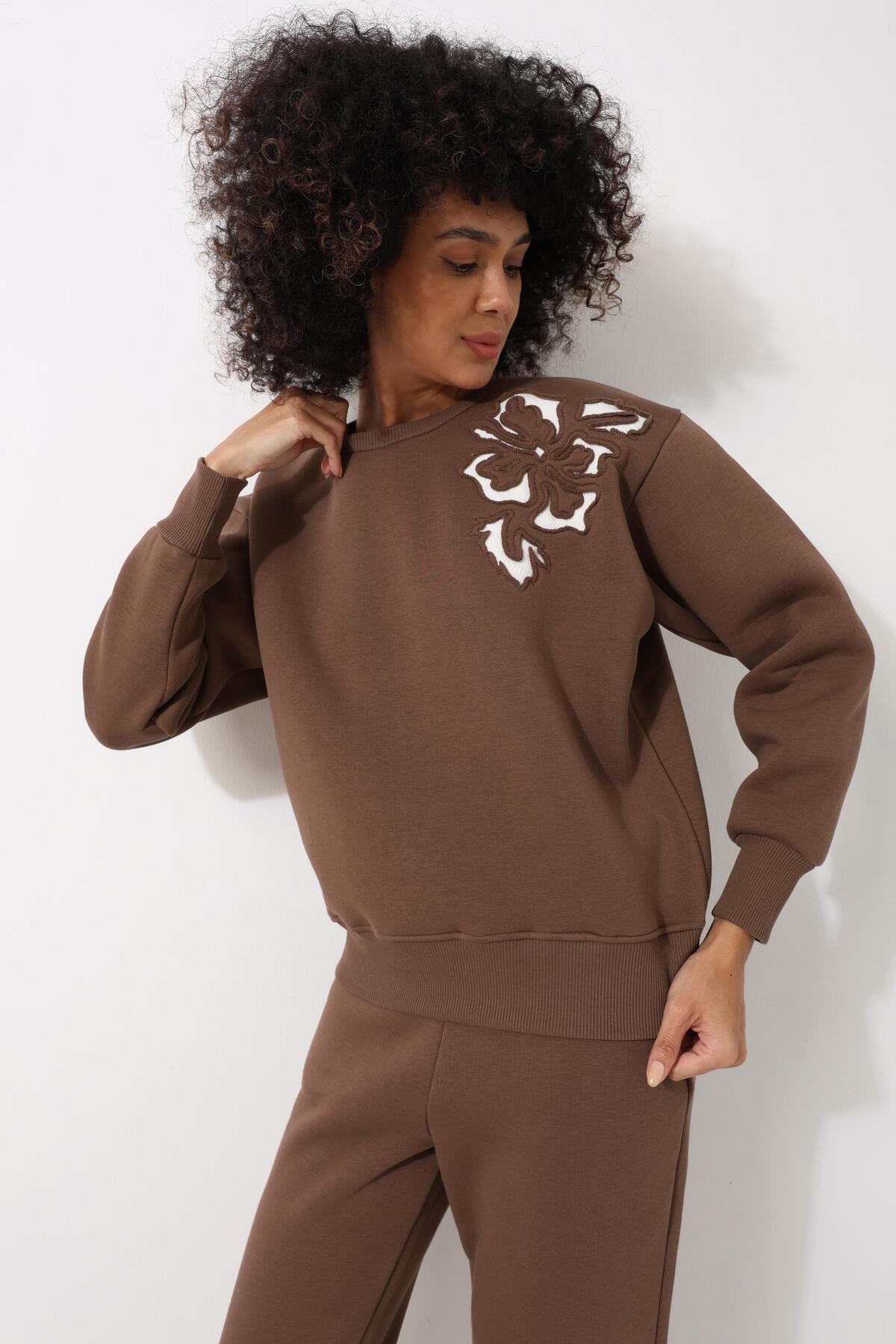 Kahverengi Omzu Lazer Kesim Çiçek Nakış Detaylı Bisiklet Yaka Oversize Kadın Sweatshirt - 2448 Kahverengi Omzu Lazer Kesim Çiçek Nakış Detaylı Bisiklet Yaka Oversize Kadın Sweatshirt - 2448 AMD2024A000048 XL