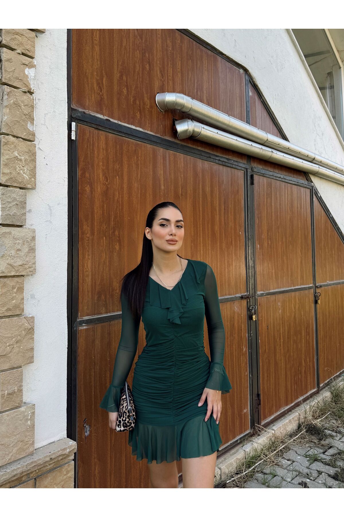 Tül Büzgülü Desenli V Yaka Elbise 3028 Tül Büzgülü Desenli V Yaka Elbise 3028 6423 L