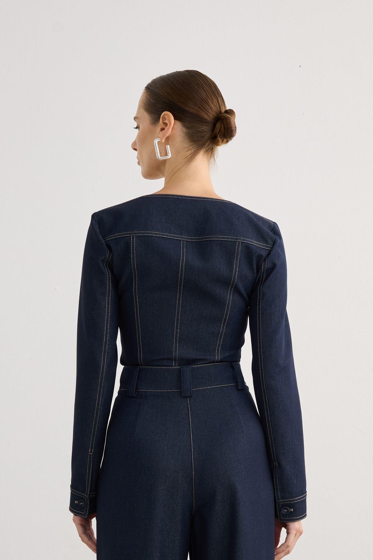 Kare Yaka Cep Detaylı Lacivert Denim Crop Gömlek Kare Yaka Cep Detaylı Lacivert Denim Crop Gömlek 21124033 L
