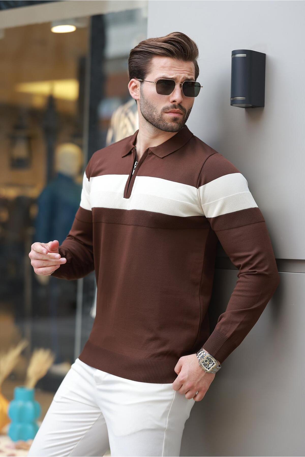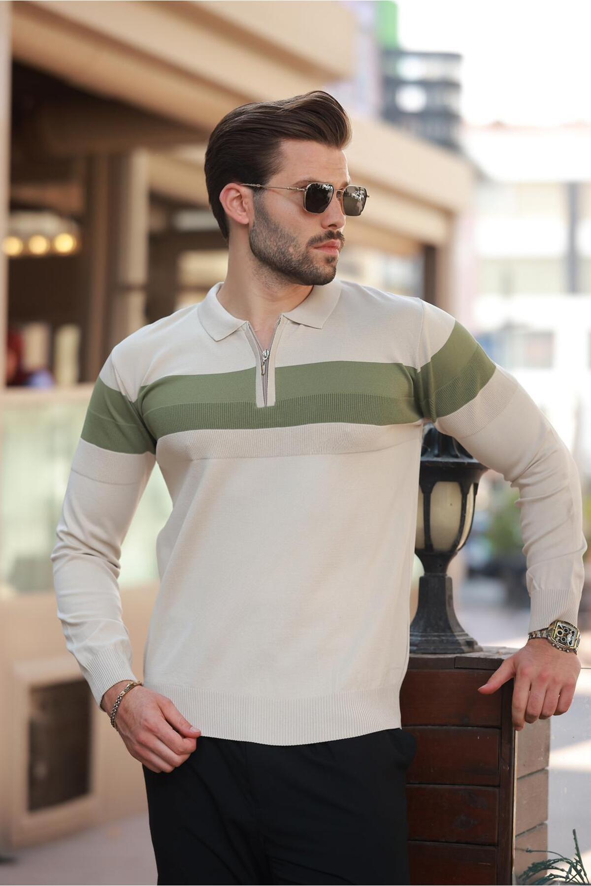 Beyaz Düğmeli Polo Yaka Çizgili Uzun Kollu Kazak 7263 Beyaz Düğmeli Polo Yaka Çizgili Uzun Kollu Kazak 7263 2XL