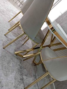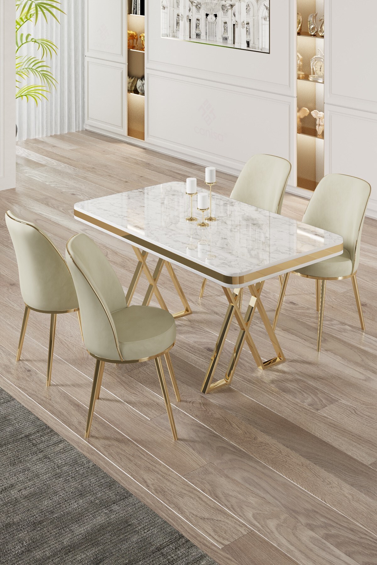 Vals Serisi 80x130 Lak Panel Beyaz Mermer Desen Masa Takımı Gold Ayaklı 4 Krem Sandalye Vals Serisi 80x130 Lak Panel Beyaz Mermer Desen Masa Takımı Gold Ayaklı 4 Krem Sandalye 22VLSBYZMR04GLD تک سایز