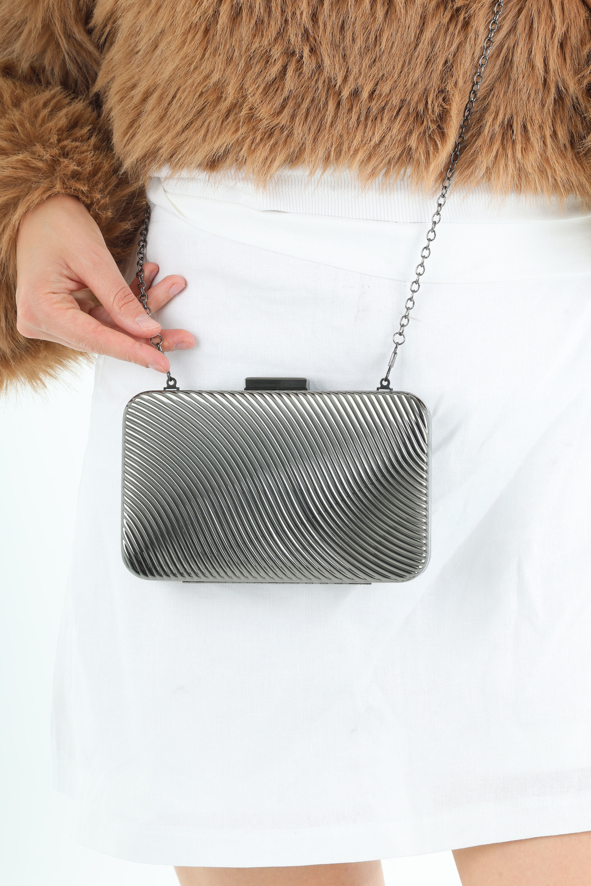 Kadın Gümüş Metal Çizgi Detaylı Abiye Baget Çanta Omuz Zincirli Kadın Gümüş Metal Çizgi Detaylı Abiye Baget Çanta Omuz Zincirli METAL-3 تک سایز