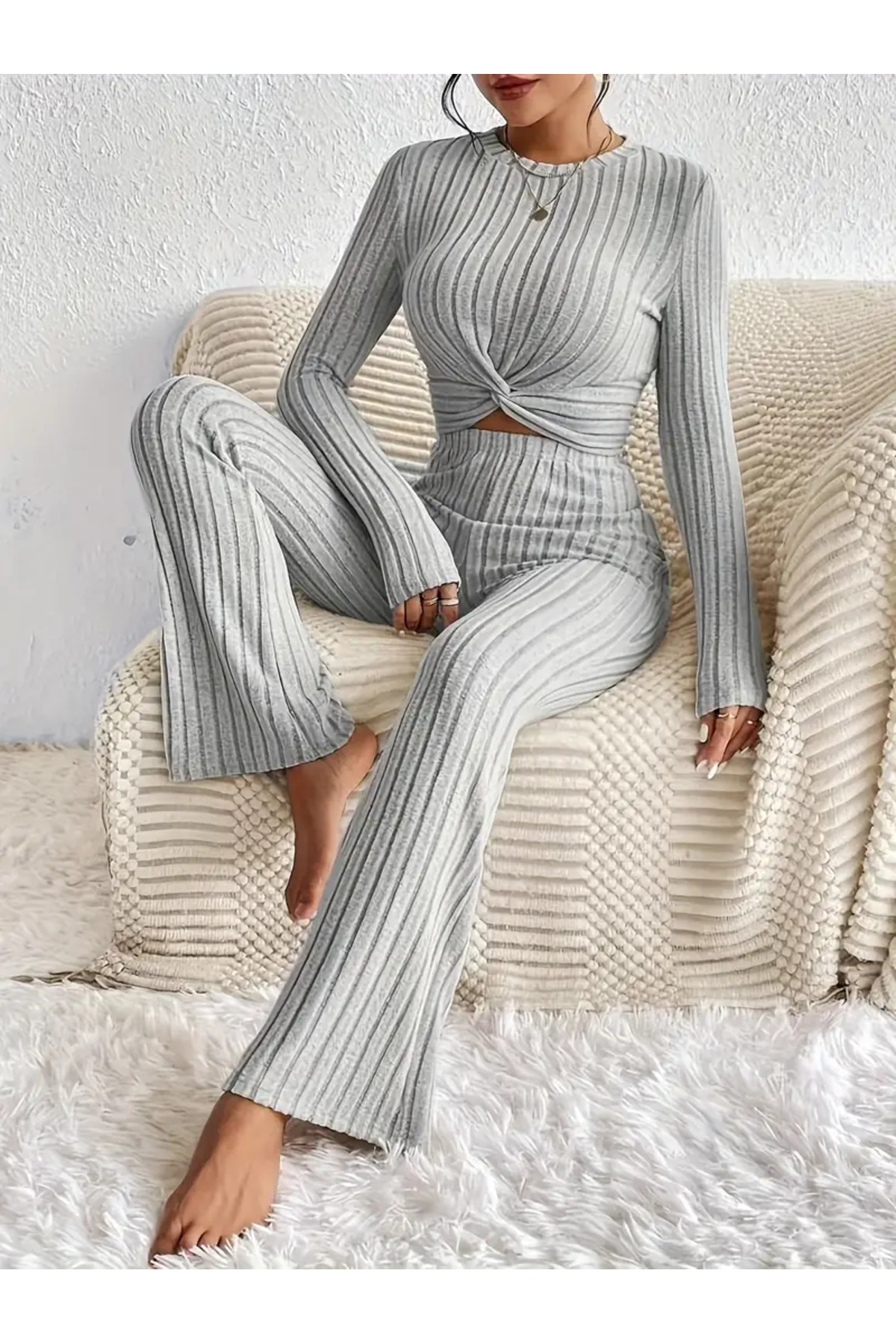 Bej Uzun Kollu Yuvarlak Yaka Yüksek Bel Ön Büküm Alt Üst Takımı Bej Uzun Kollu Yuvarlak Yaka Yüksek Bel Ön Büküm Alt Üst Takımı FLOWER3539 XL