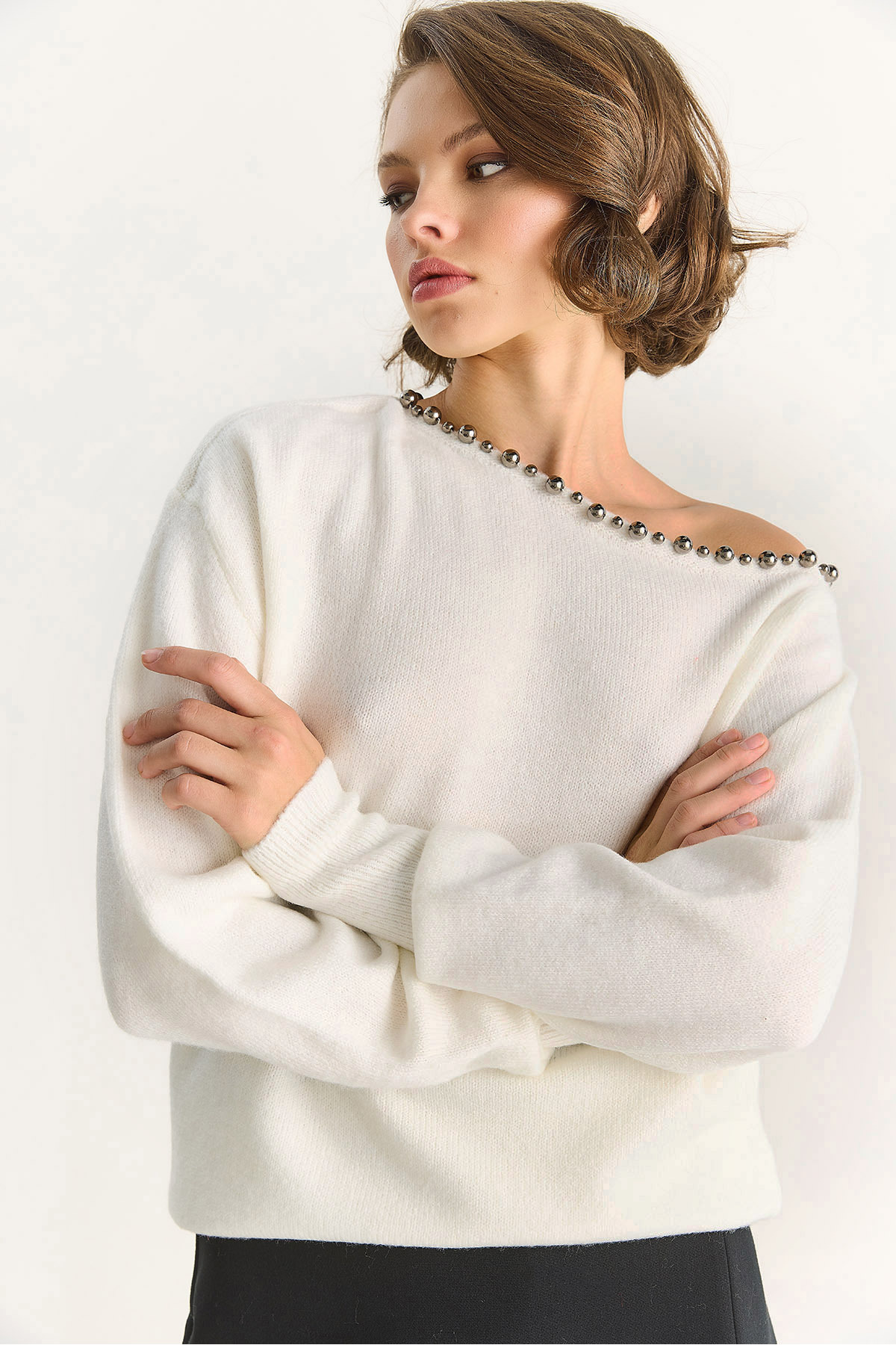 Taş Şeritli V Yaka Siyah Triko Kazak Taş Şeritli V Yaka Siyah Triko Kazak 2425W108800 L