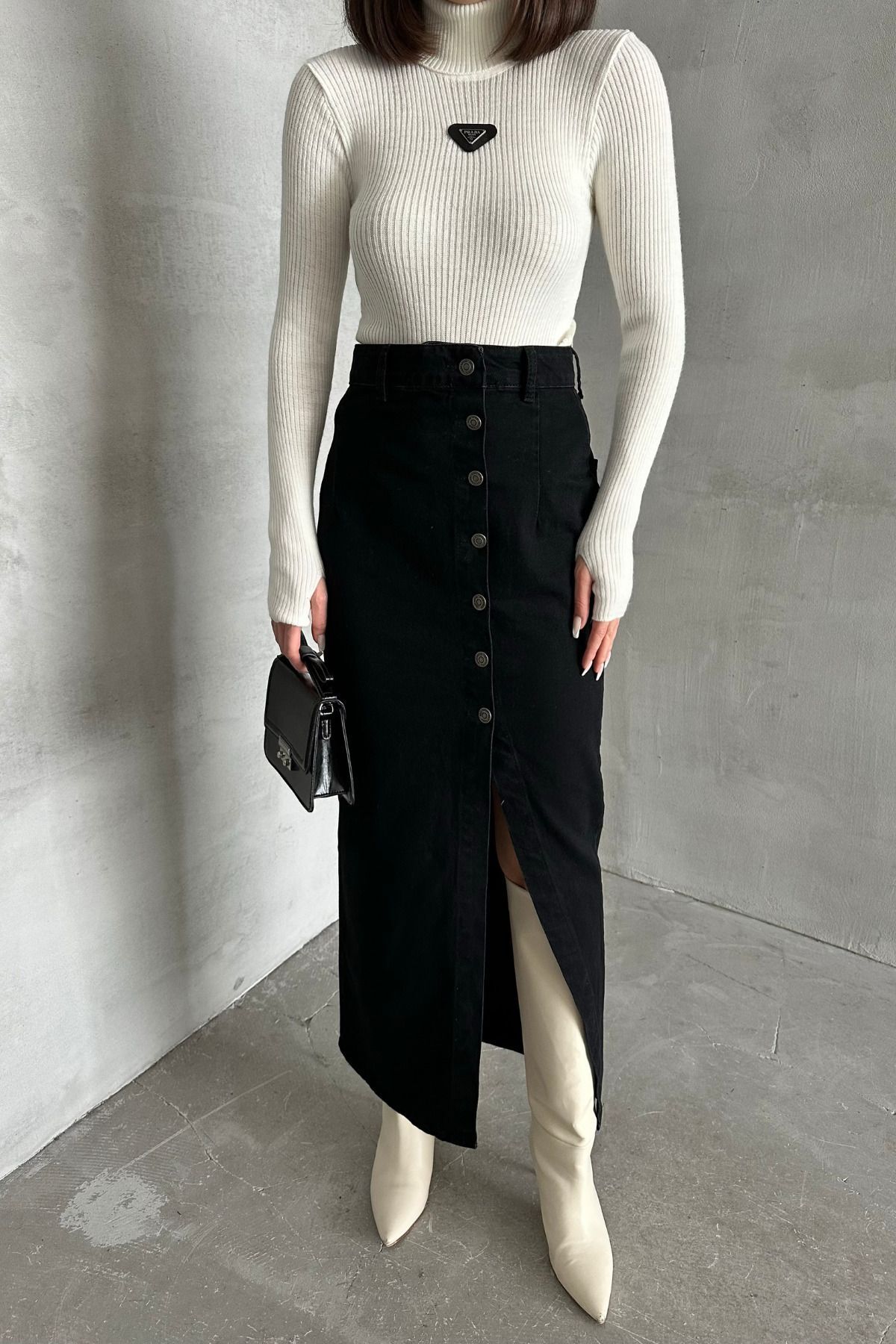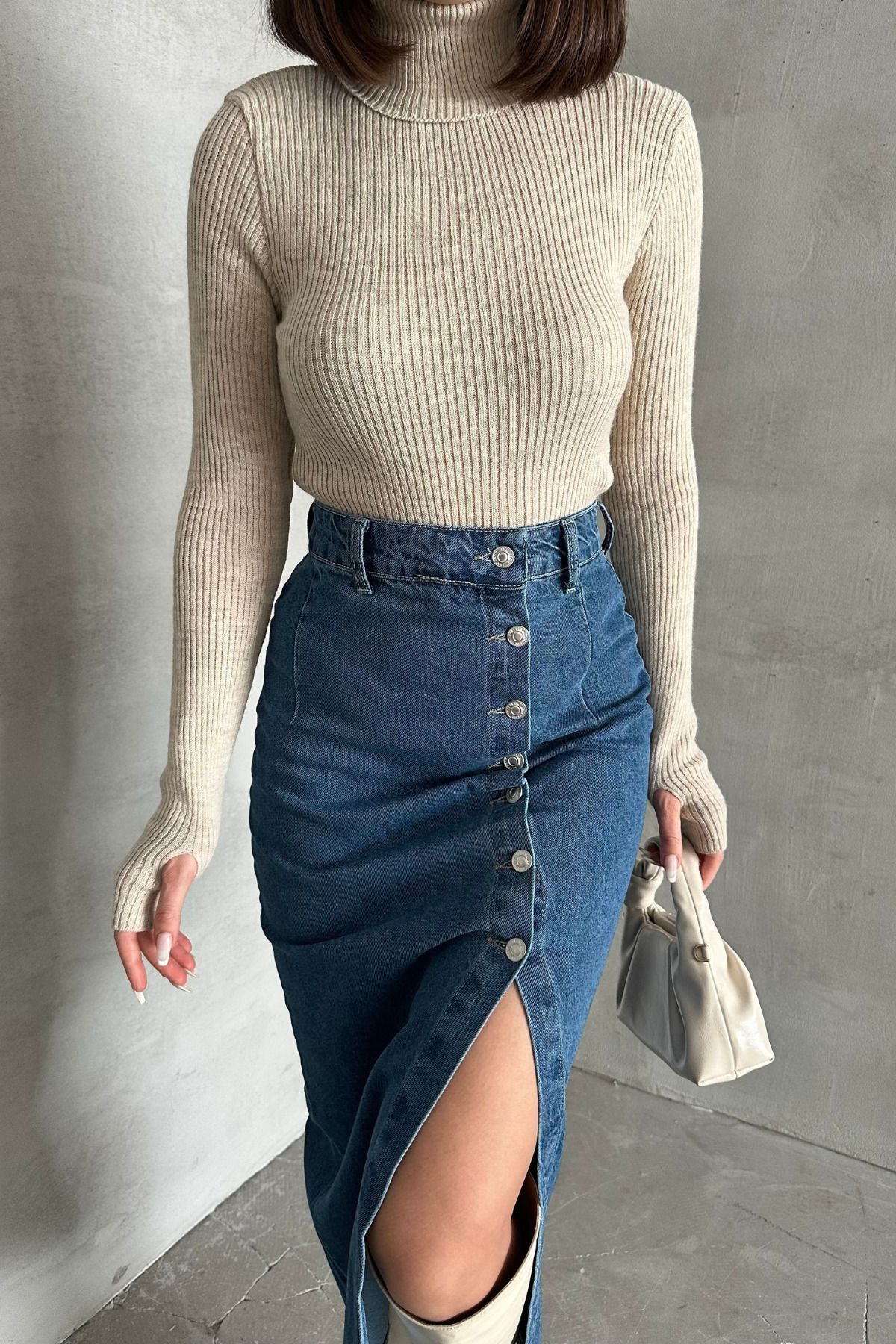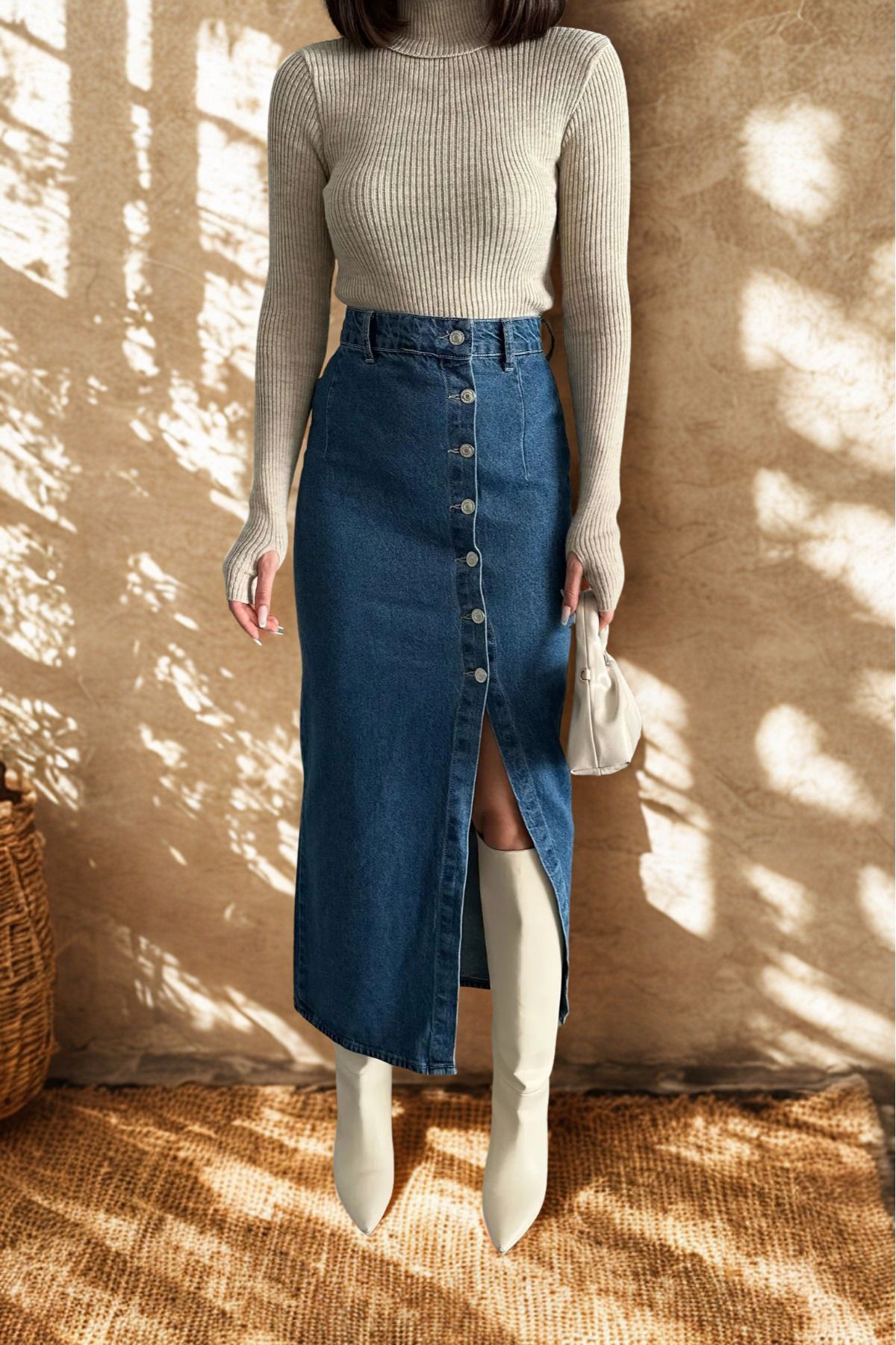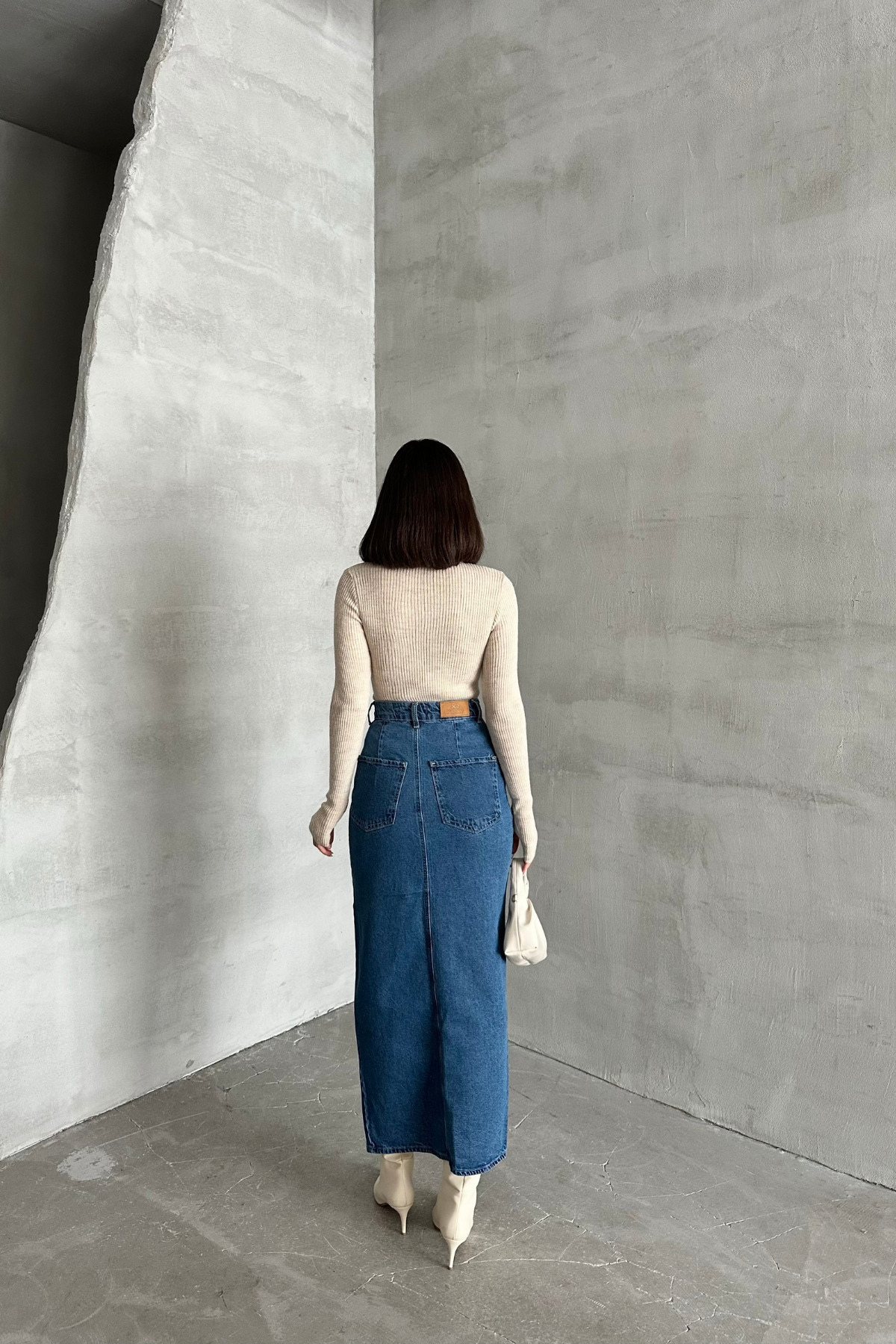 Kadın Bilek Boy Uzun Yırtmaçlı Dar Mavi Kot Etek Kadın Bilek Boy Uzun Yırtmaçlı Dar Mavi Kot Etek 203XRDN 42