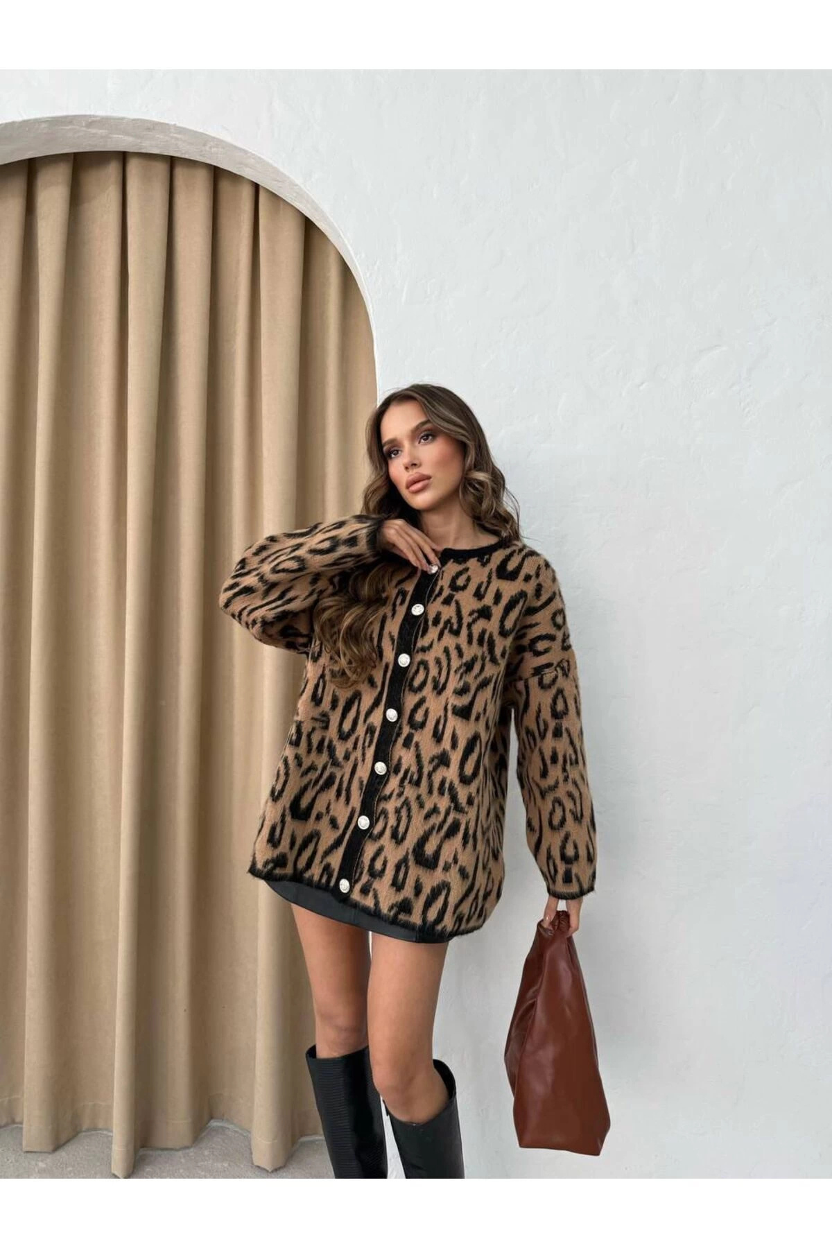 Swc Leopar Triko Hırka Kadın Bisiklet Yaka Leopar Desenli Kahverengi Yünlü Hırka Swc Leopar Triko Hırka Kadın Bisiklet Yaka Leopar Desenli Kahverengi Yünlü Hırka Standart