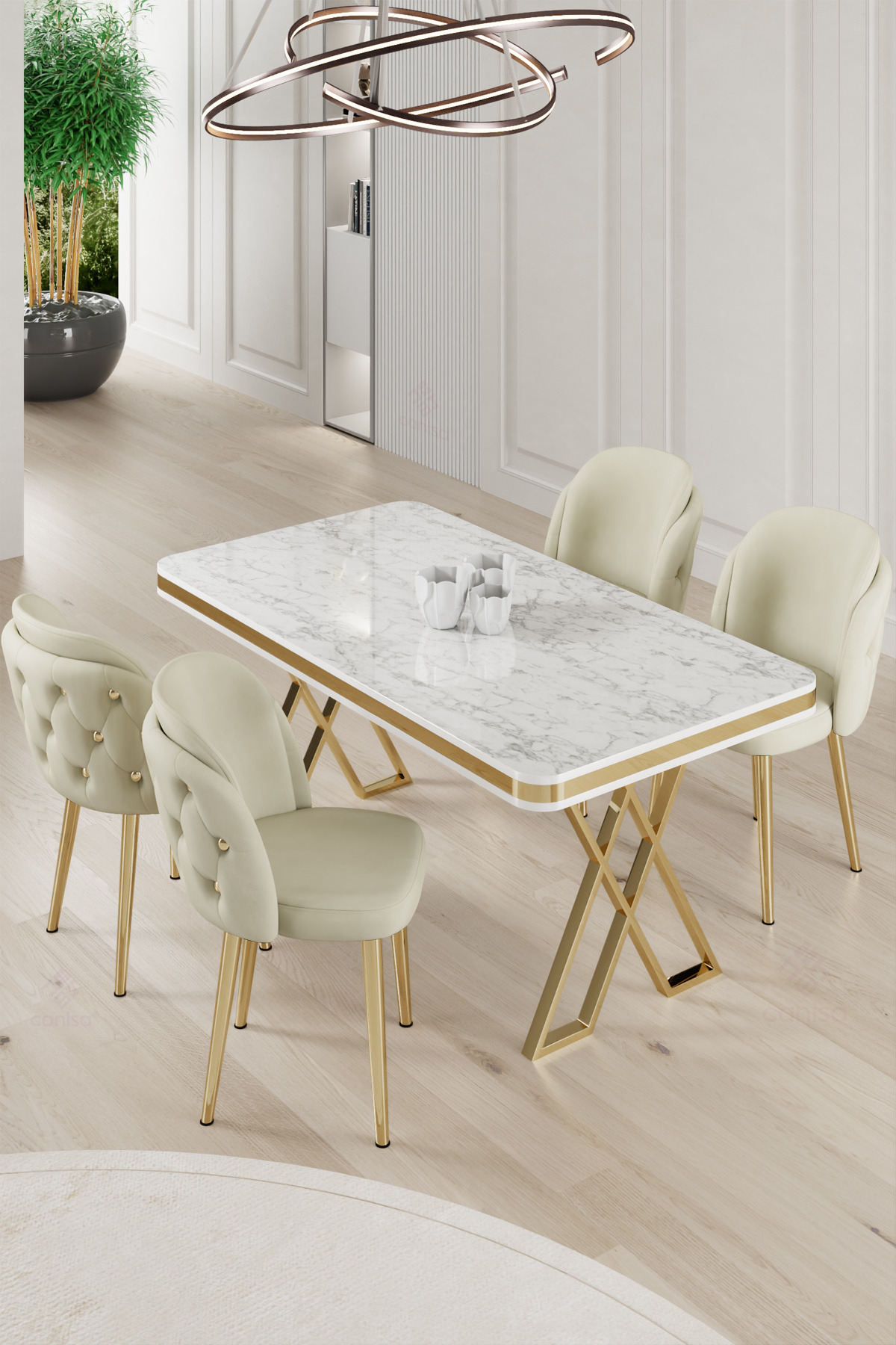 Rigel Serisi 80x130 Lak Panel Beyaz Mermer Desen Masa Takımı Gold Ayaklı 4 Krem Sandalye Rigel Serisi 80x130 Lak Panel Beyaz Mermer Desen Masa Takımı Gold Ayaklı 4 Krem Sandalye 22RGL04BYZMR04GLD تک سایز