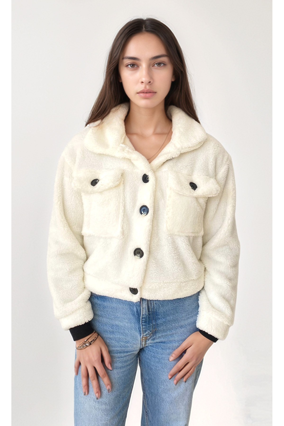 Kadın Siyah Polo Yaka Çift Cepli Çıtçıt Kapamalı Peluş Ceket ALC-X12951 Kadın Siyah Polo Yaka Çift Cepli Çıtçıt Kapamalı Peluş Ceket ALC-X12951 XL