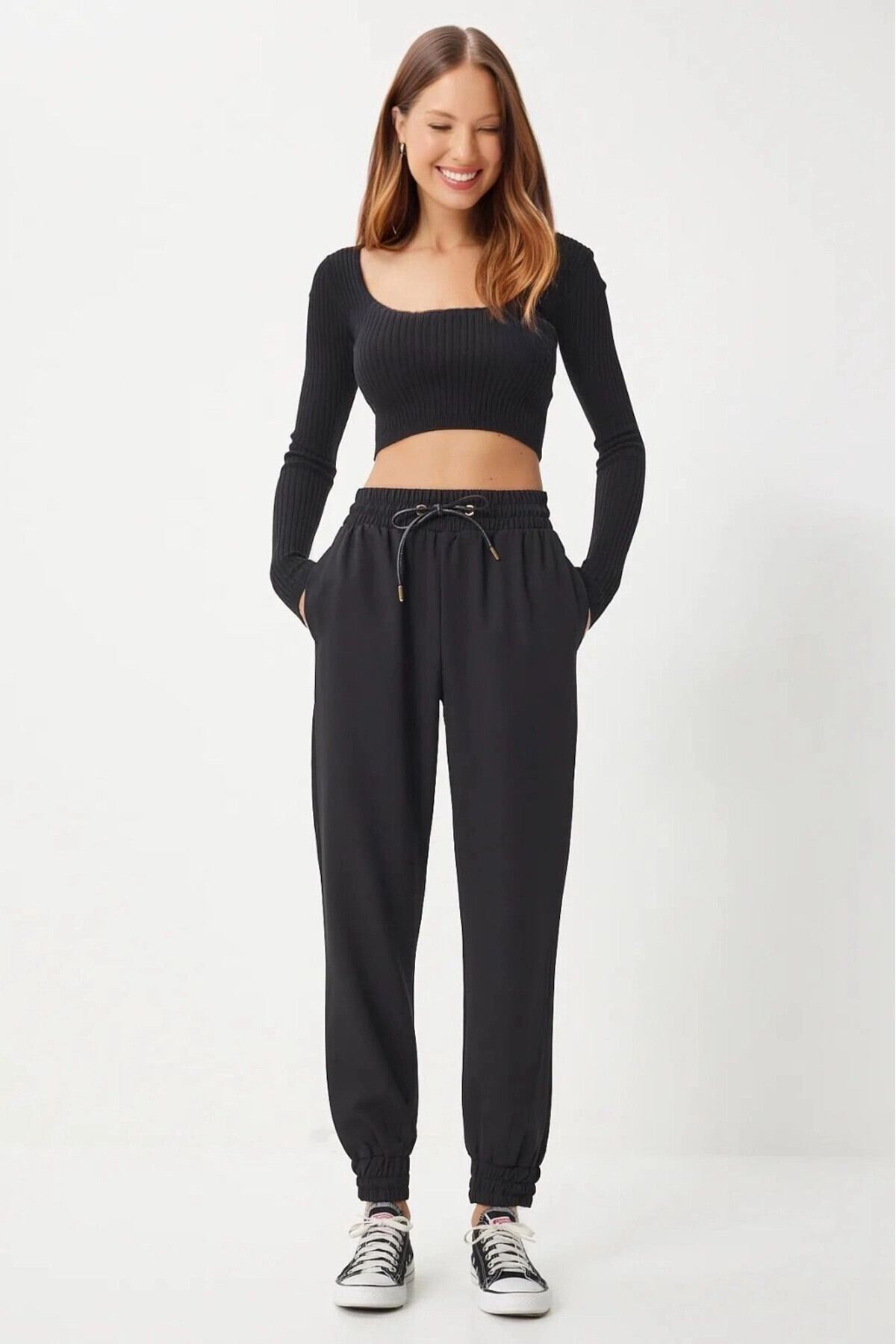 Kadın Siyah Cepli Kordon Kemerli Jogger Eşofman Pantolon HZL25W-BD166741 Kadın Siyah Cepli Kordon Kemerli Jogger Eşofman Pantolon HZL25W-BD166741 42