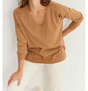 Kadın Vizon V Yaka Taşlı İnce Triko Bluz YİL002 Kadın Vizon V Yaka Taşlı İnce Triko Bluz YİL002 Tek Ebat
