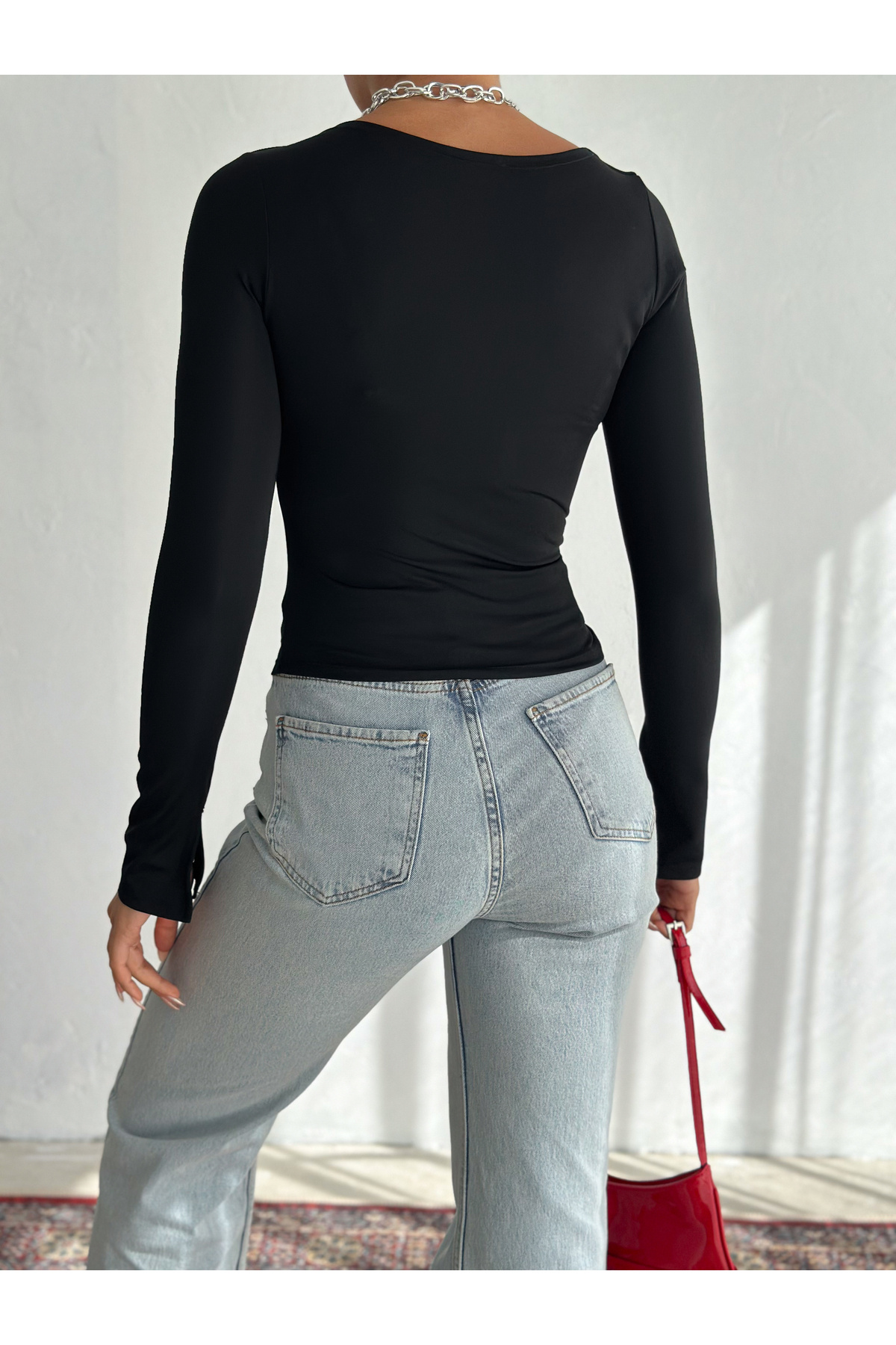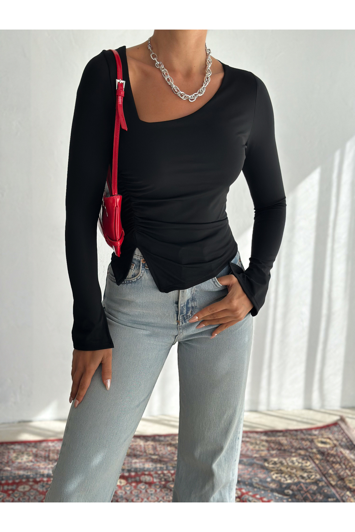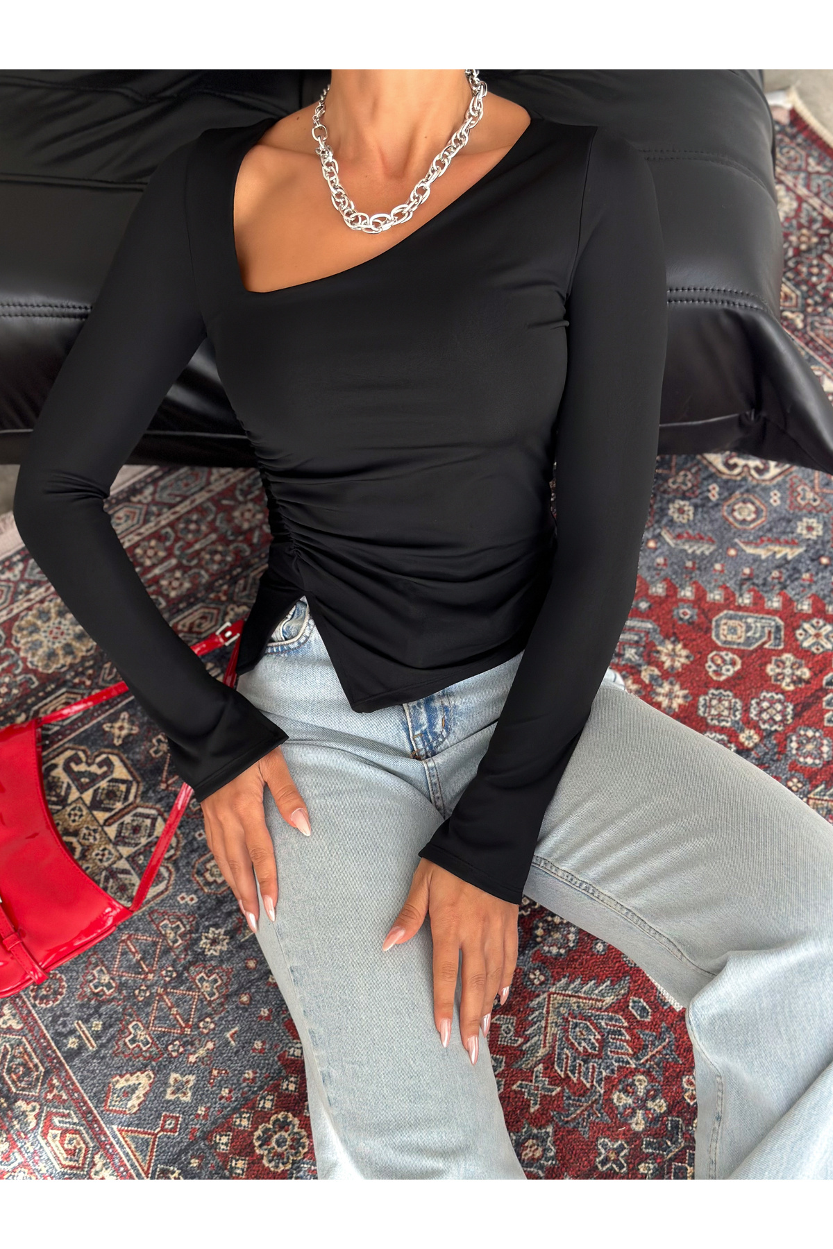 Kadın Siyah Asimetrik Yaka Asimetrik Kesim Büzgülü Dalgıç Kumaş Bluz Kadın Siyah Asimetrik Yaka Asimetrik Kesim Büzgülü Dalgıç Kumaş Bluz QTT262 L