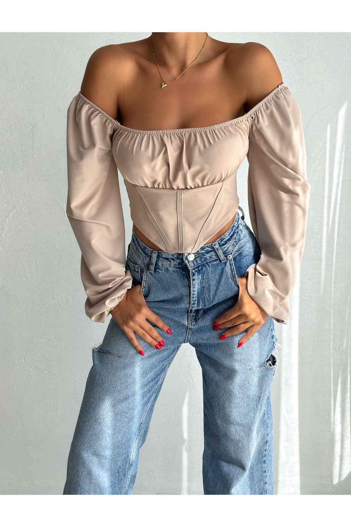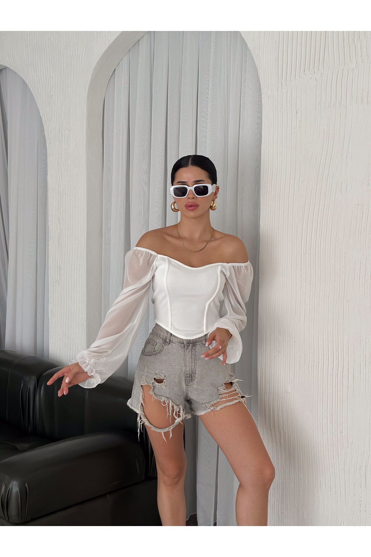 Kadın Beyaz Önü Biyeli Şifon Kol Uzun Kol Crop Bluz Kadın Beyaz Önü Biyeli Şifon Kol Uzun Kol Crop Bluz QTT263 L