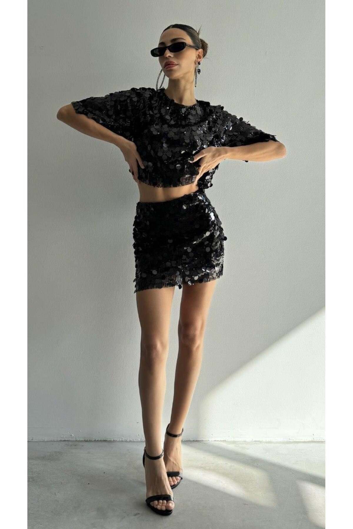 Payetli Siyah Crop Pantolon Takım Payetli Siyah Crop Pantolon Takım BM-1591 L