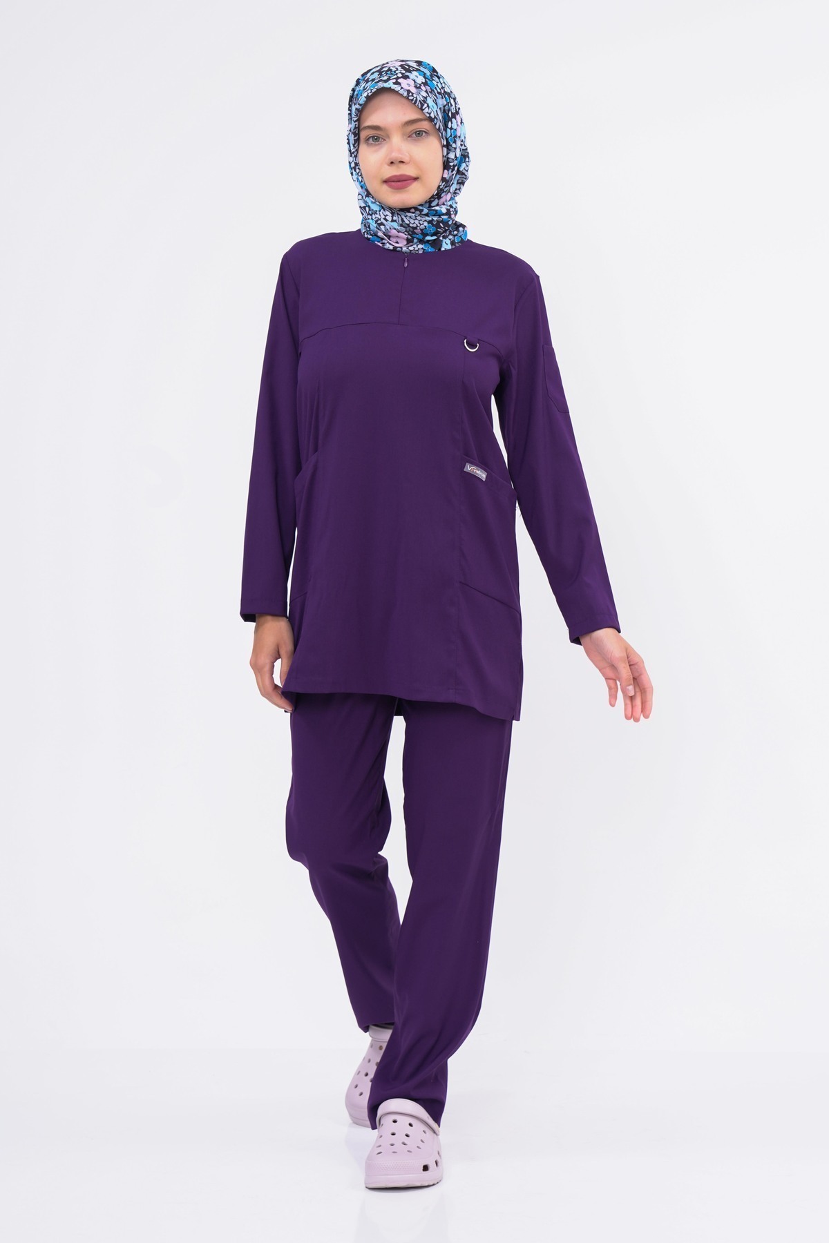 Tesettür Lüks Likralı Medikal Üniforma Mor Doktor Ve Hemşire Forması Cerrahi Fermuarlı Takım V-016 Tesettür Lüks Likralı Medikal Üniforma Mor Doktor Ve Hemşire Forması Cerrahi Fermuarlı Takım V-016 2XL