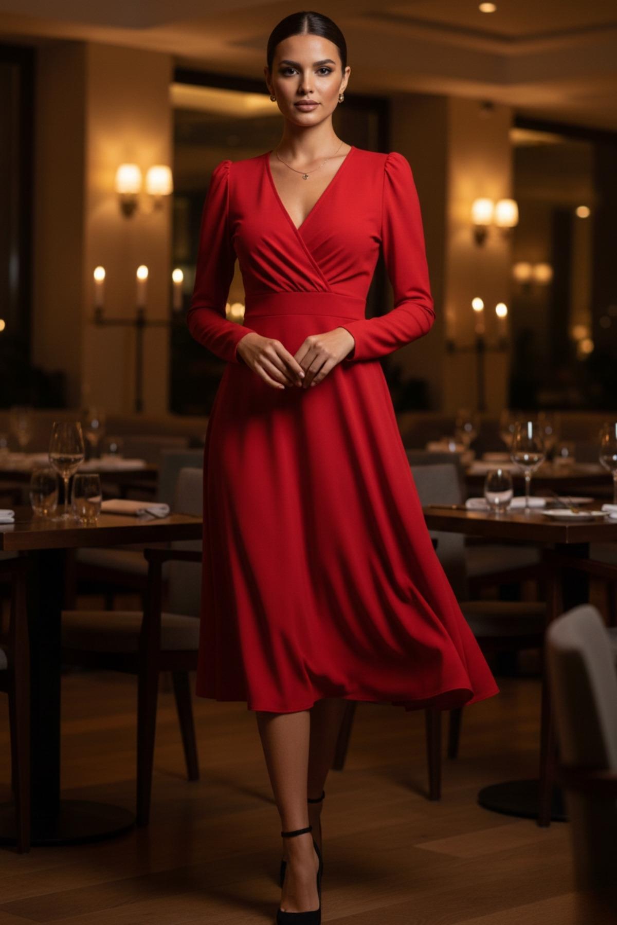 UZUN KOLLU KRUVAZE YAKA DANTEL DETAYLI KIRMIZI ELBİSE UZUN KOLLU KRUVAZE YAKA DANTEL DETAYLI KIRMIZI ELBİSE TRİO-079 40