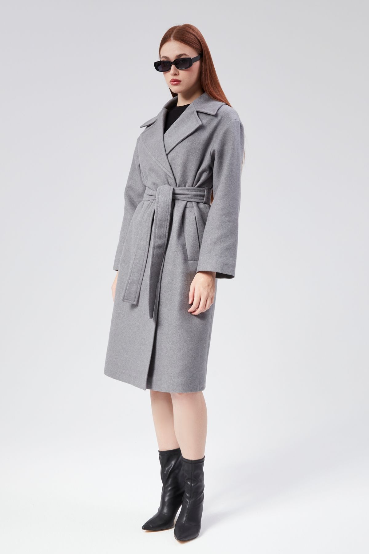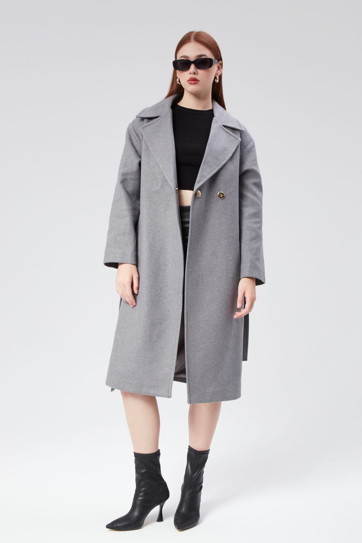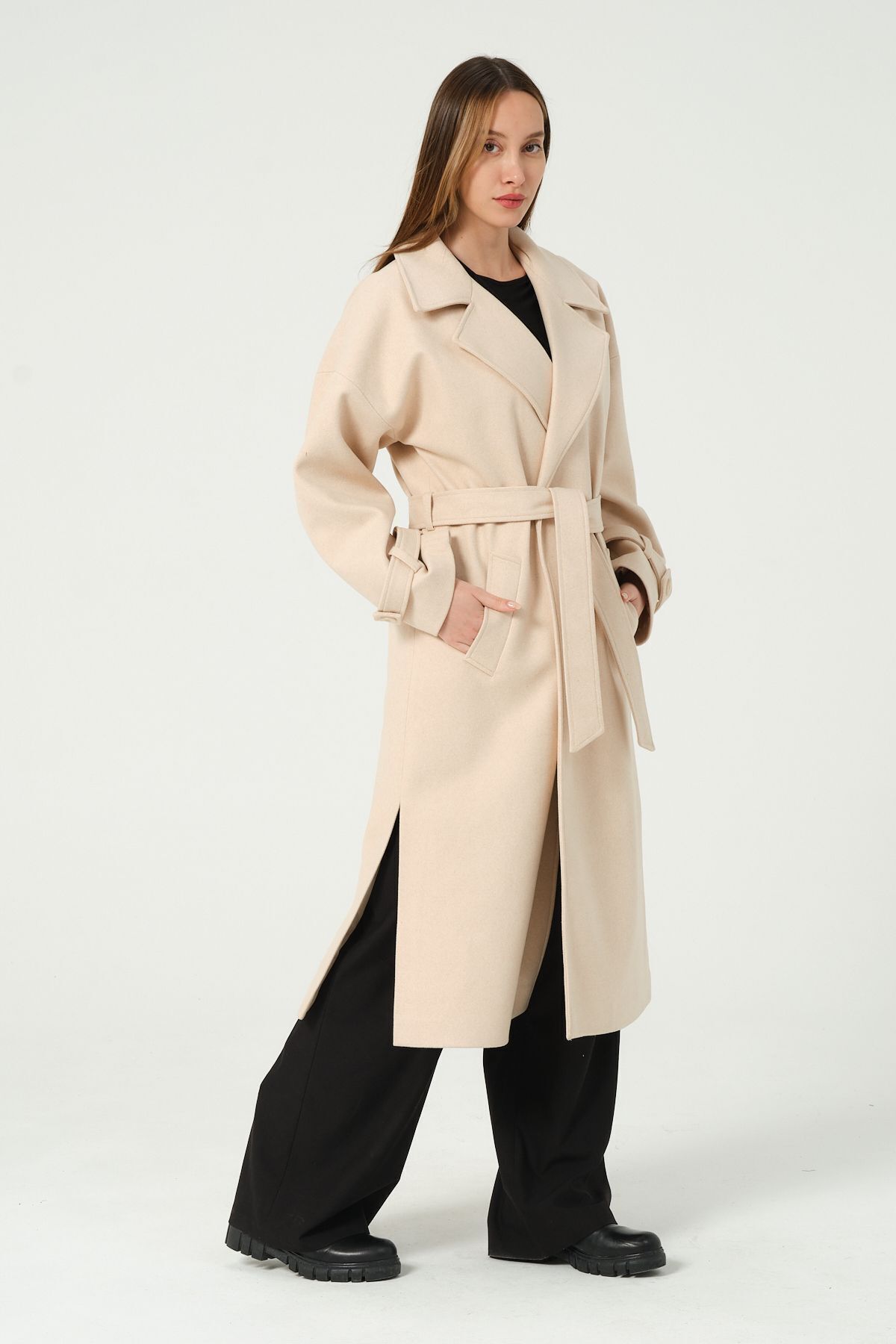 Kadın Kruvaze Yaka Kuşak Detaylı Kaşe Kaban Kadın Kruvaze Yaka Kuşak Detaylı Kaşe Kaban 44915 XL
