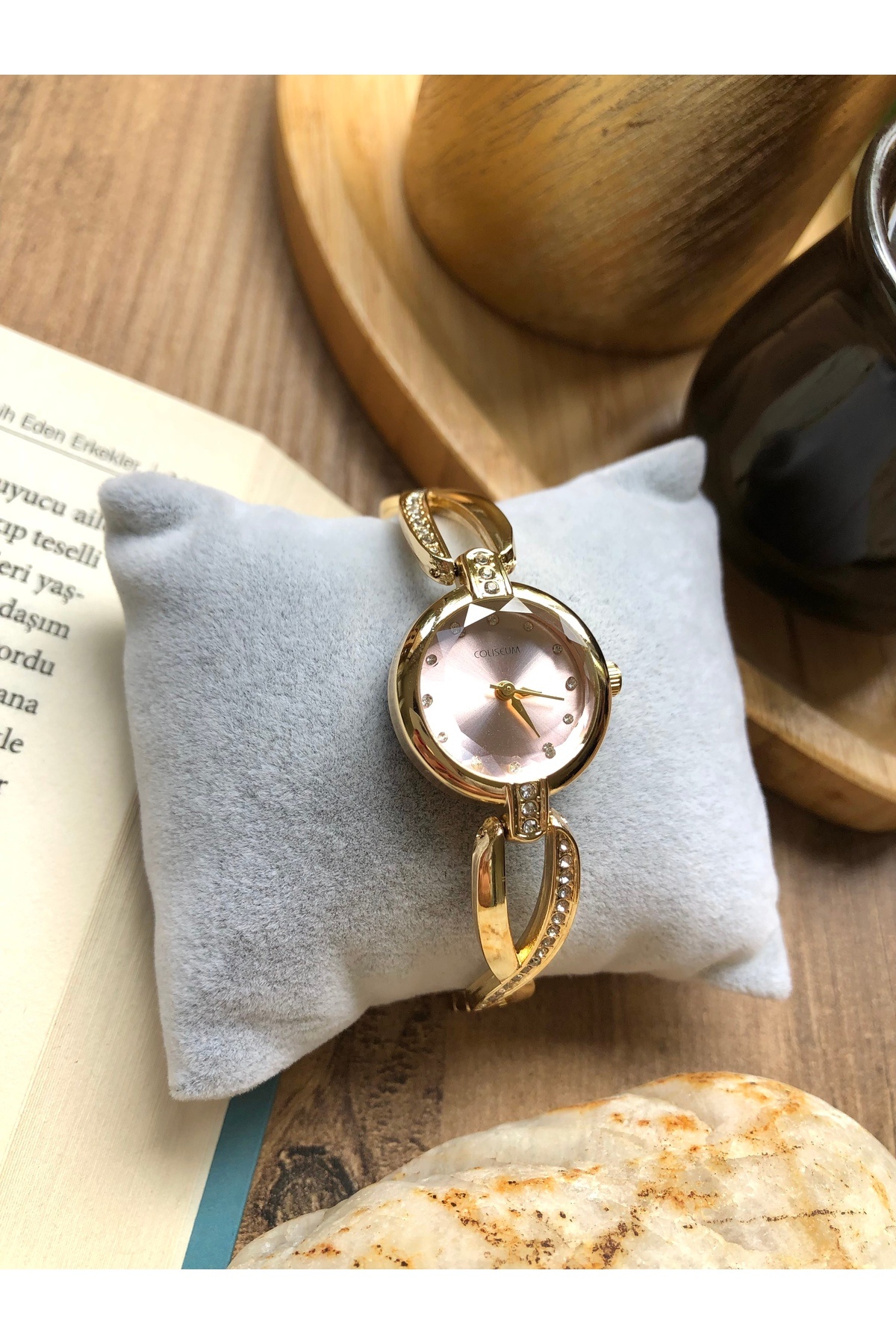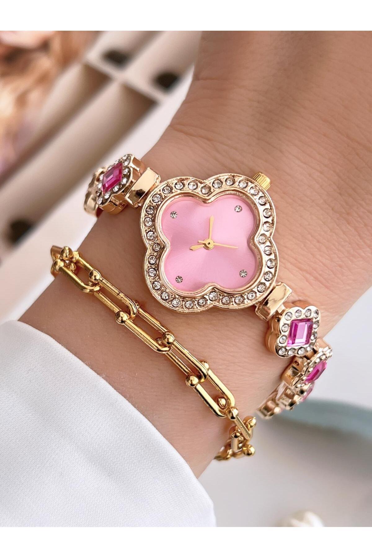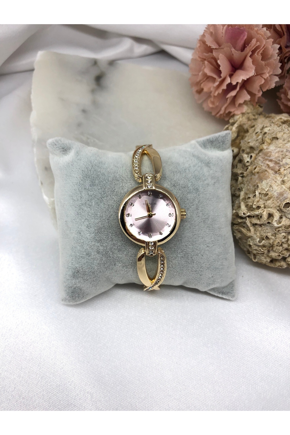 Yuvarlak Kordonu Tasarım Detaylı Minik Taşlı İçi Pembe Gold Kadın Kol Saati Yuvarlak Kordonu Tasarım Detaylı Minik Taşlı İçi Pembe Gold Kadın Kol Saati TD1364 تک سایز