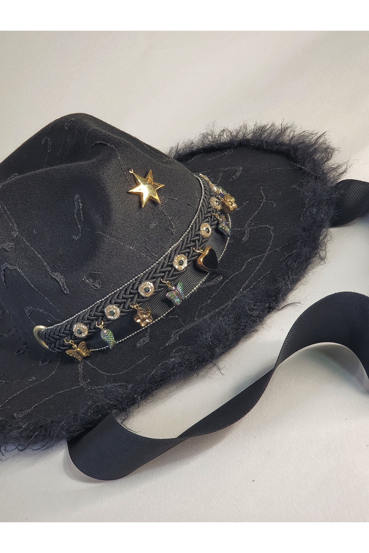 SALLANTILI KUŞAK VE CHARM CAM BONCUK DETAYLI EL BOYAMA SİYAH KADIN FÖTR ŞAPKA SALLANTILI KUŞAK VE CHARM CAM BONCUK DETAYLI EL BOYAMA SİYAH KADIN FÖTR ŞAPKA CHARMSTARFOTR 57