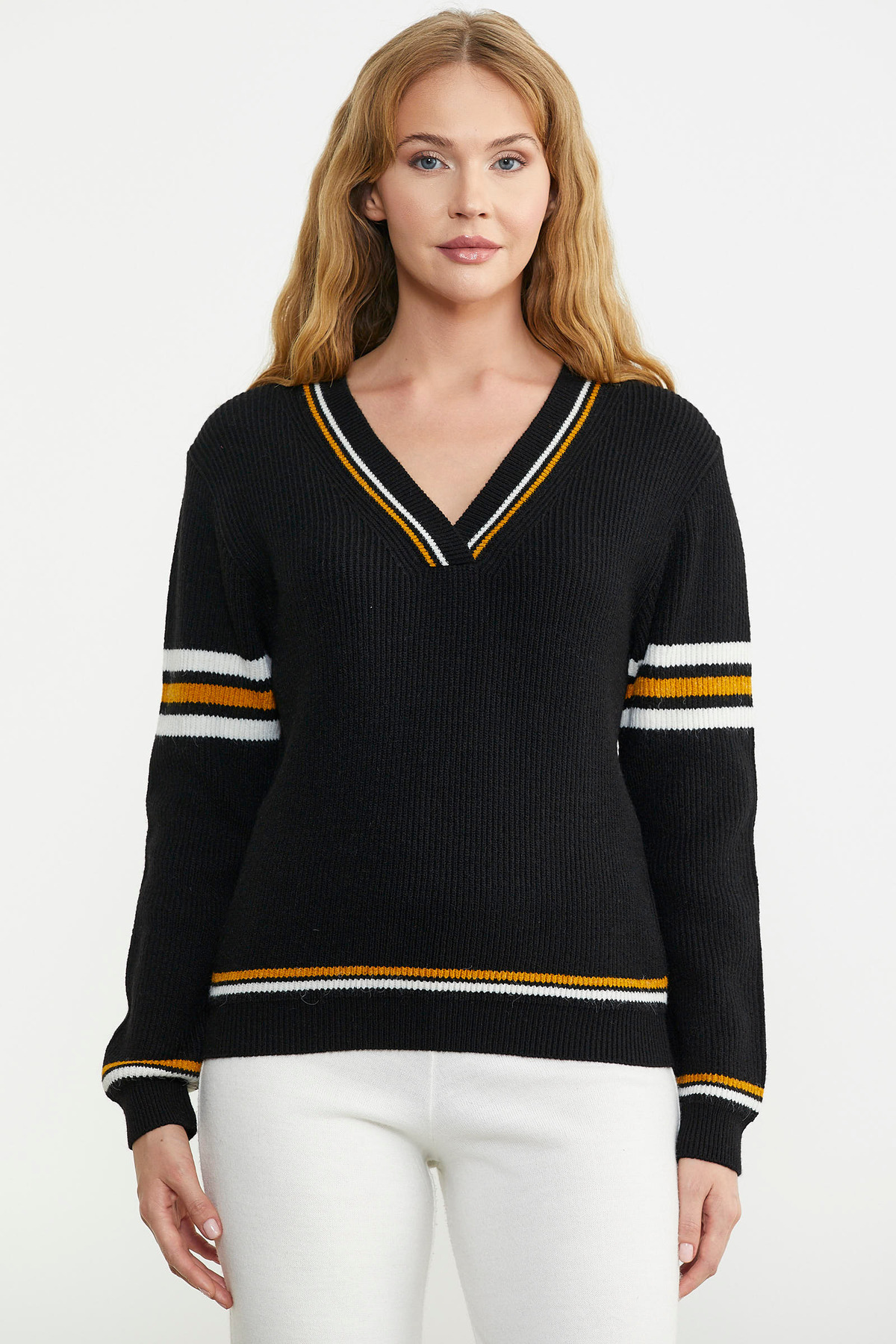 V Yaka Çizgi Kombinli Triko Kazak - Siyah V Yaka Çizgi Kombinli Triko Kazak - Siyah 24K2115-32497.0001 L