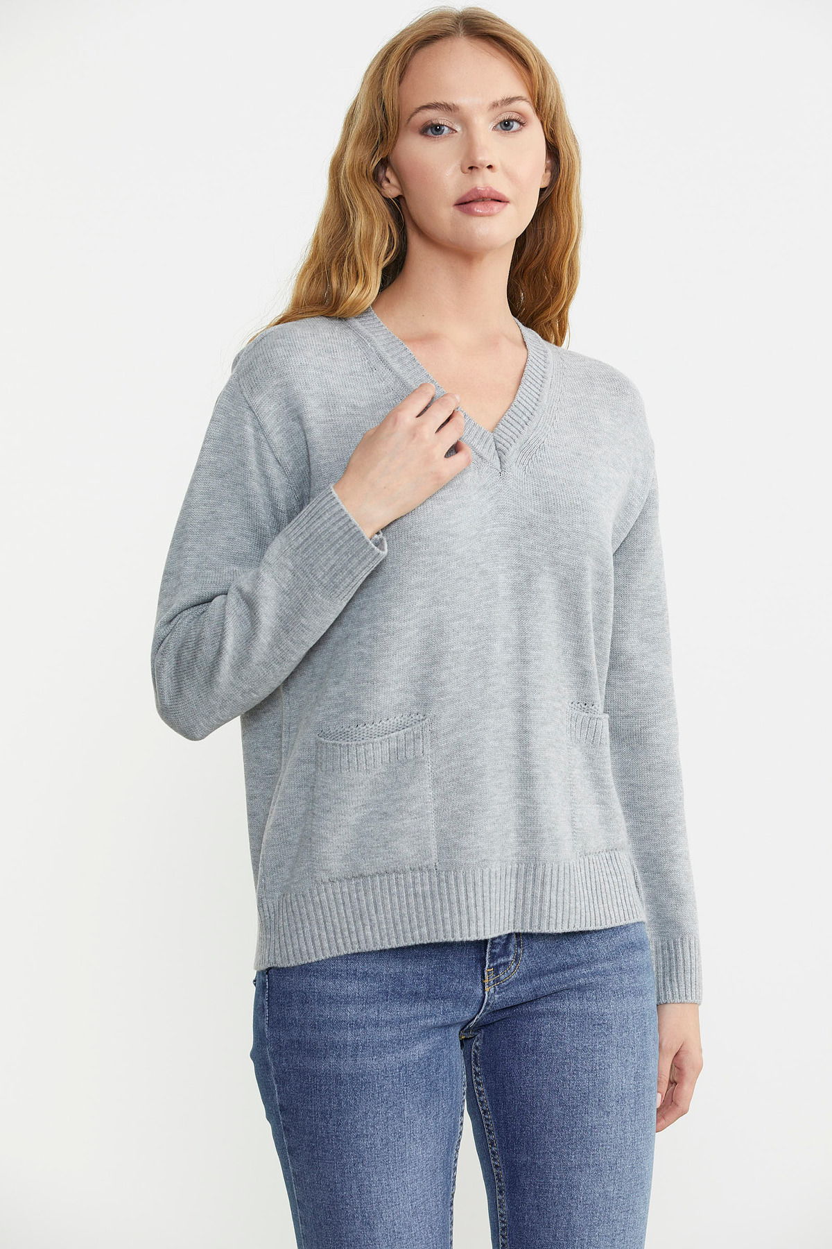Cep Detaylı V Yaka Triko Kazak - Gri Cep Detaylı V Yaka Triko Kazak - Gri 24K2115-32555.0001 M