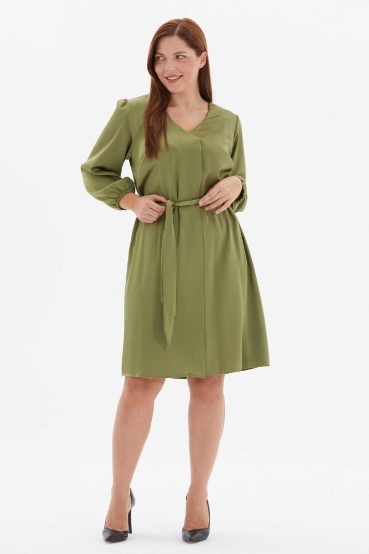 Büyük Beden Önü Plili Bağlamalı Saten Elbise Büyük Beden Önü Plili Bağlamalı Saten Elbise 24KSL7504 48
