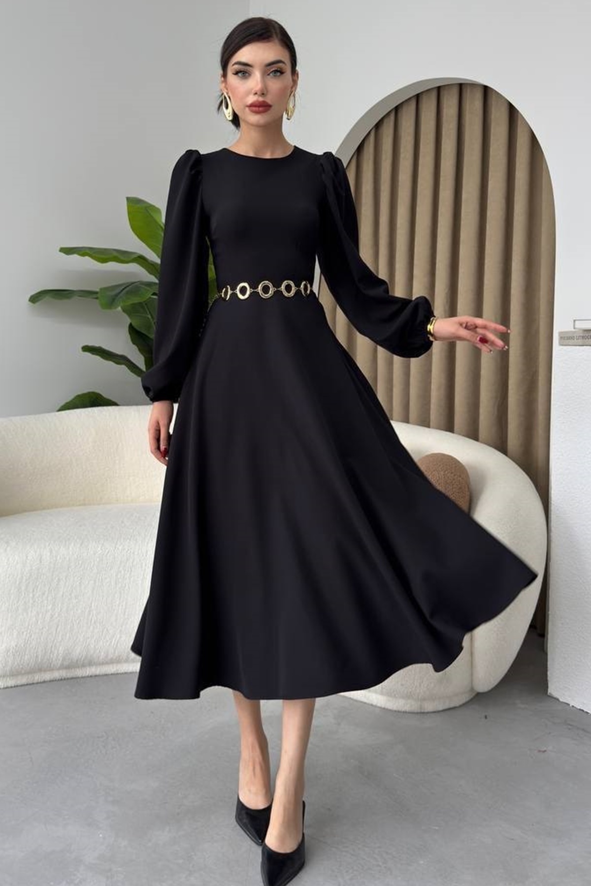 Kadın Siyah Atlas Kumaş Bisiklet Yaka Prenses Kol Detay Midi Kloş Elbise 280 Kadın Siyah Atlas Kumaş Bisiklet Yaka Prenses Kol Detay Midi Kloş Elbise 280 280-ETC 40