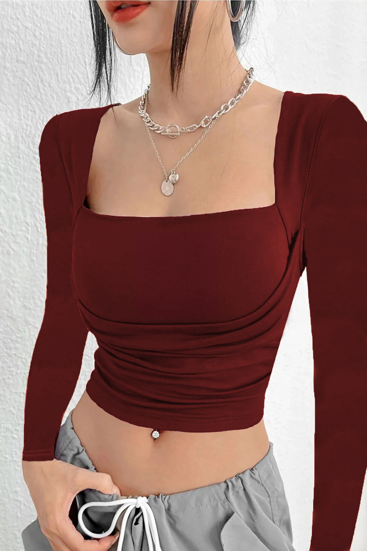 Kare Yaka Büzgü Detaylı Uzun Kollu Esnek Crop Bluz Kare Yaka Büzgü Detaylı Uzun Kollu Esnek Crop Bluz WFT5078 L