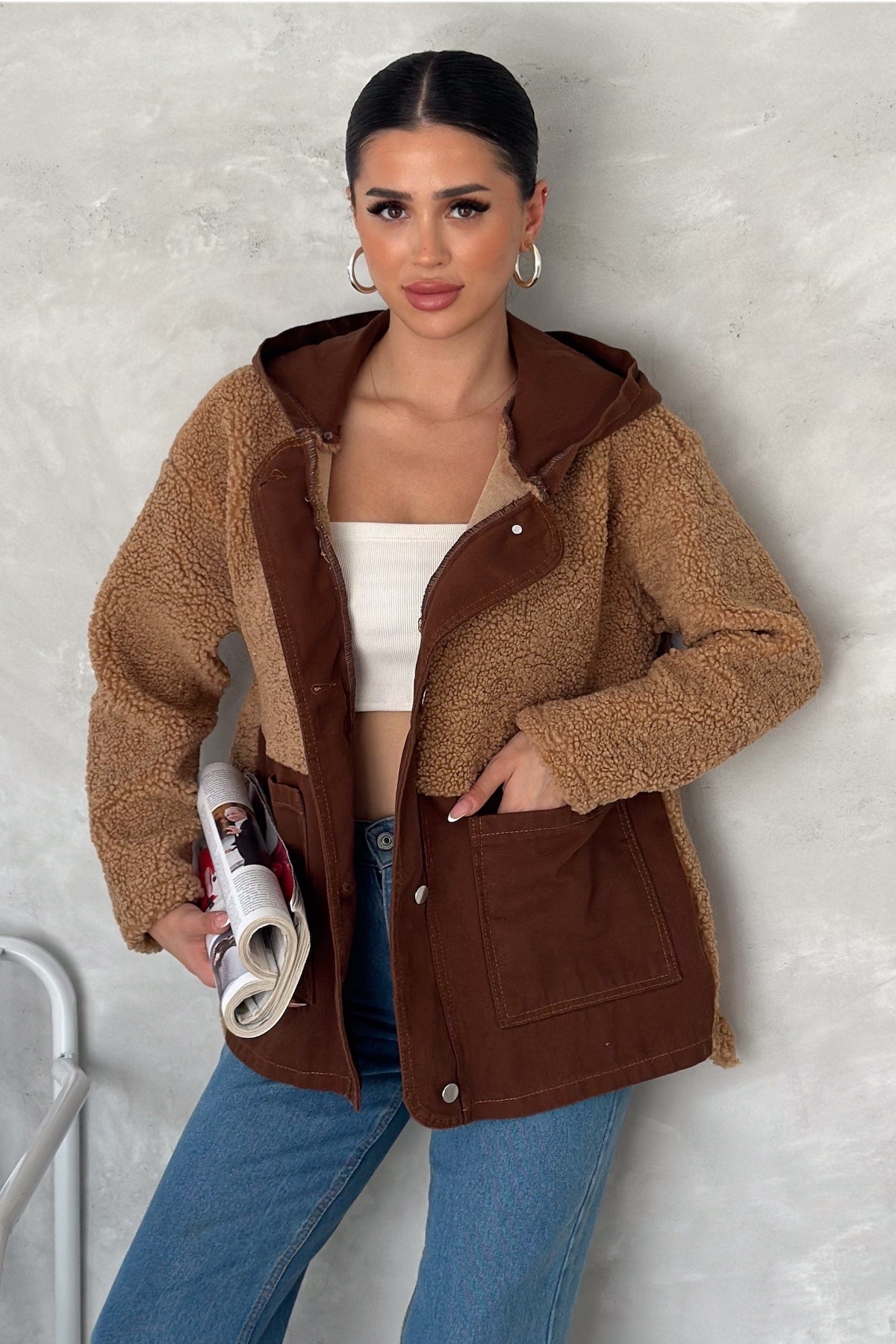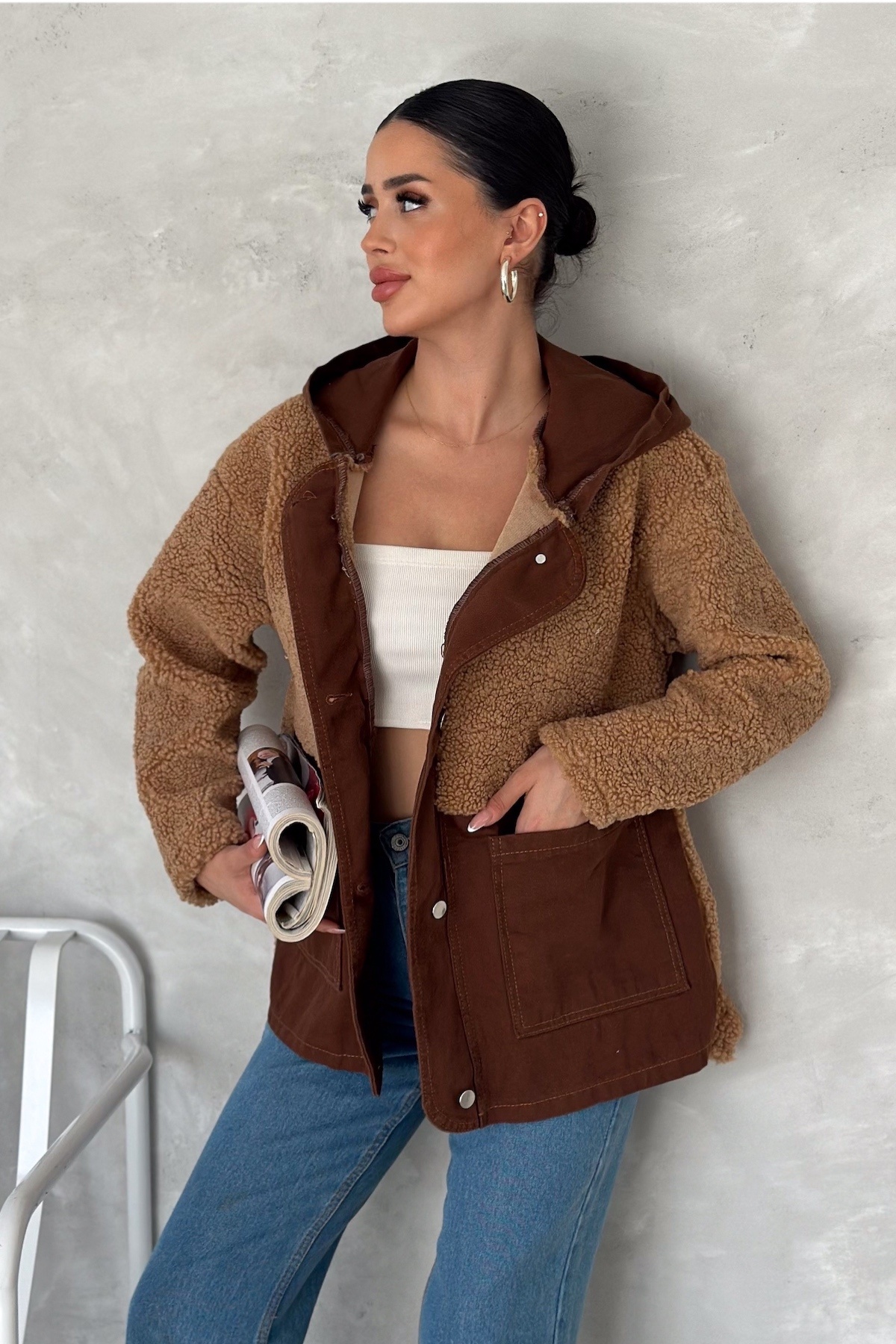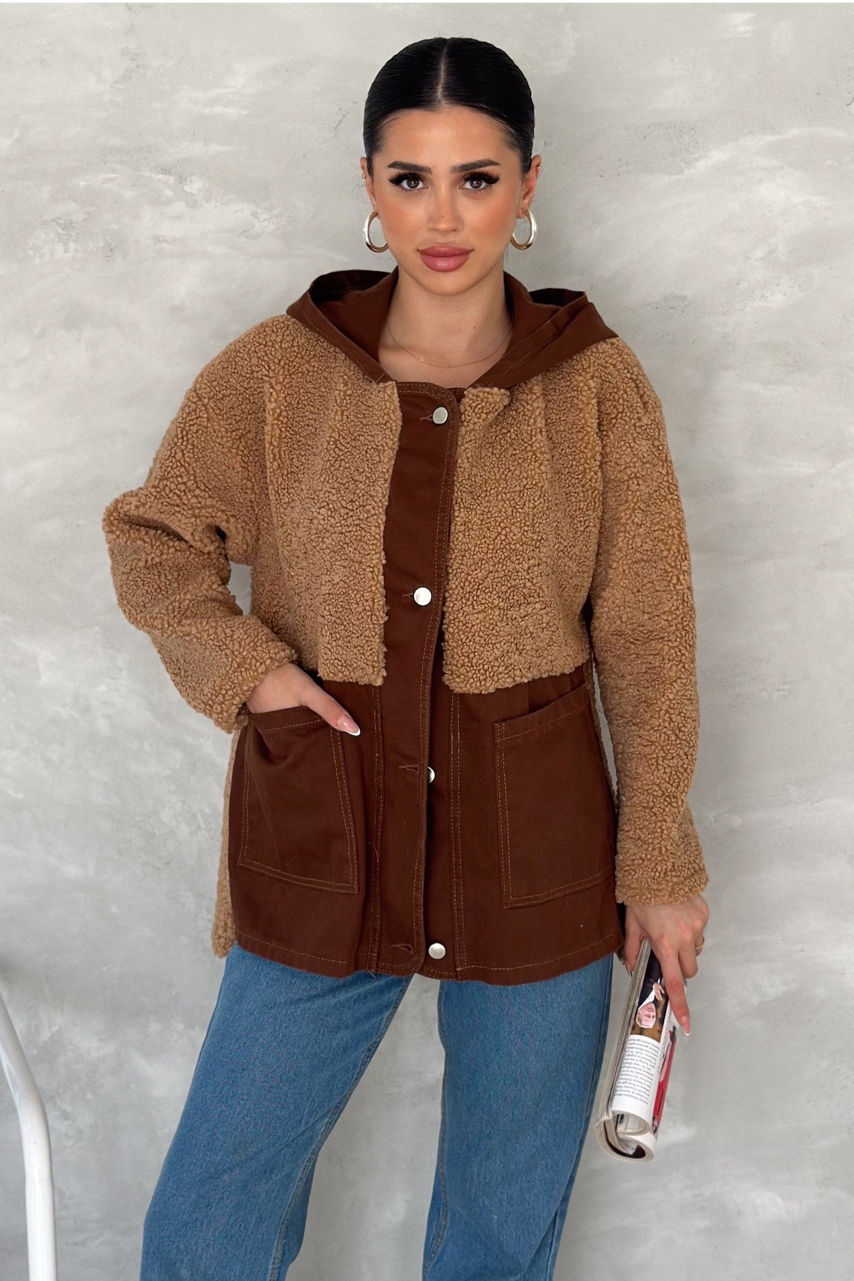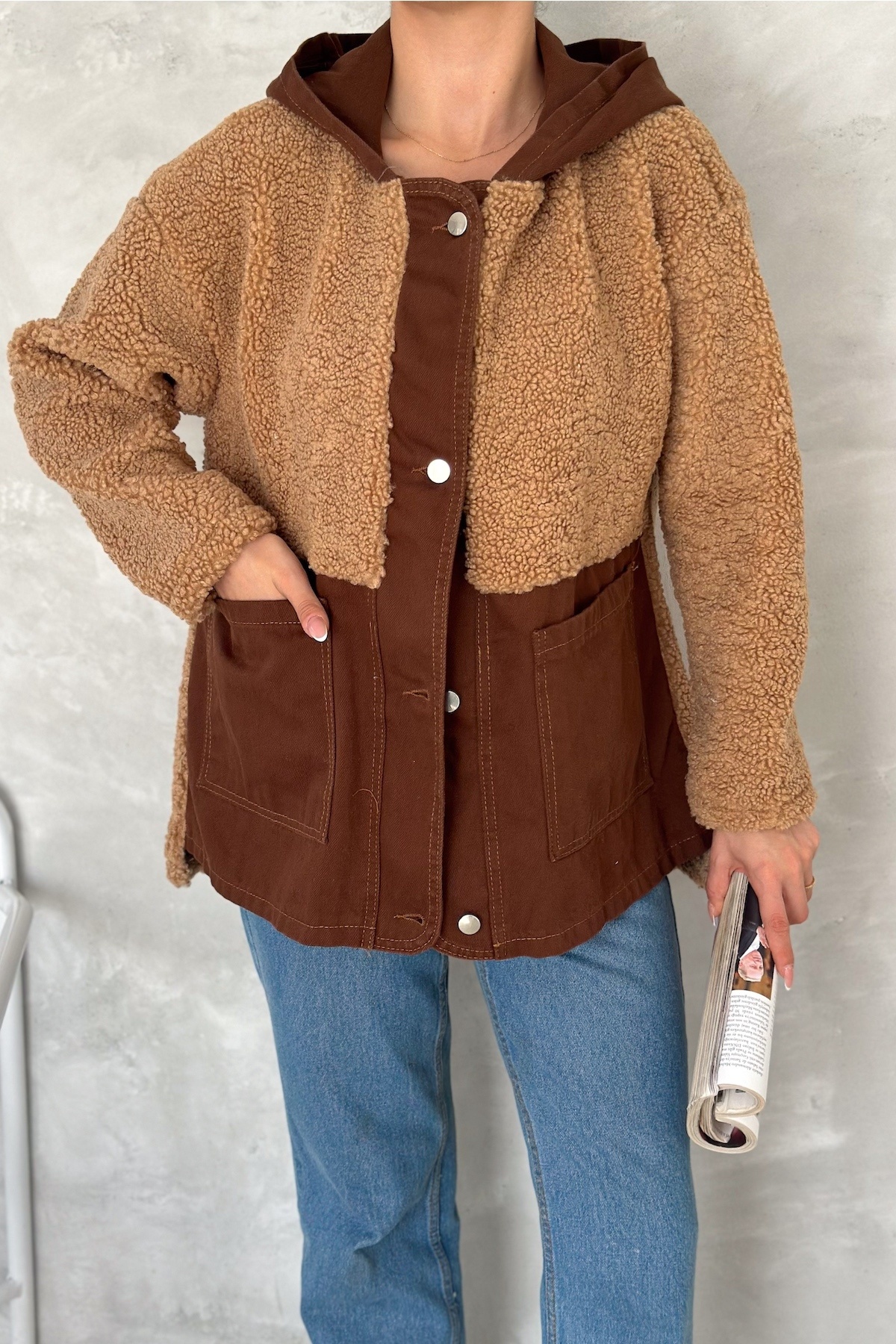 Kadın Kahverengi Çıtçıt Düğmeli Kapüşonlu Gabardin Peluş Ceket Kadın Kahverengi Çıtçıt Düğmeli Kapüşonlu Gabardin Peluş Ceket 14163 L